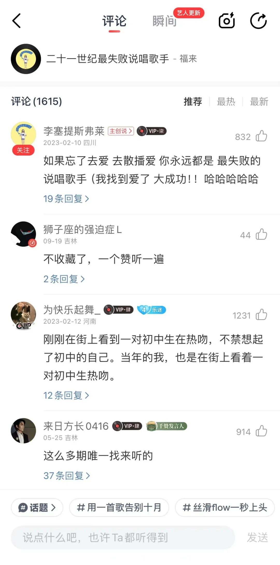 巧思得到了回报。专辑很快成为福来最受欢迎的作品,同名主打曲现在在网易云音乐有 1600+ 的评论;今年上了综艺,福来也凭着这首有趣的曲目给观众留下深刻印象。“最失败说唱歌手”甚至变成了一个标签,贴在福来身上。