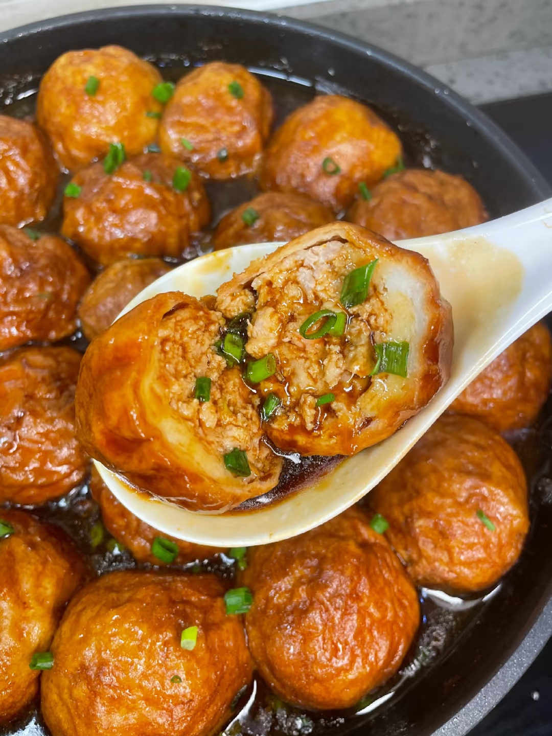 小贴士:油面筋选圆滚滚、颜色金黄的,捏起来有弹性;肉馅可以用现成的,但自己剁的更香哦!