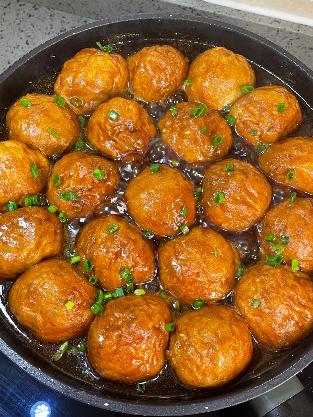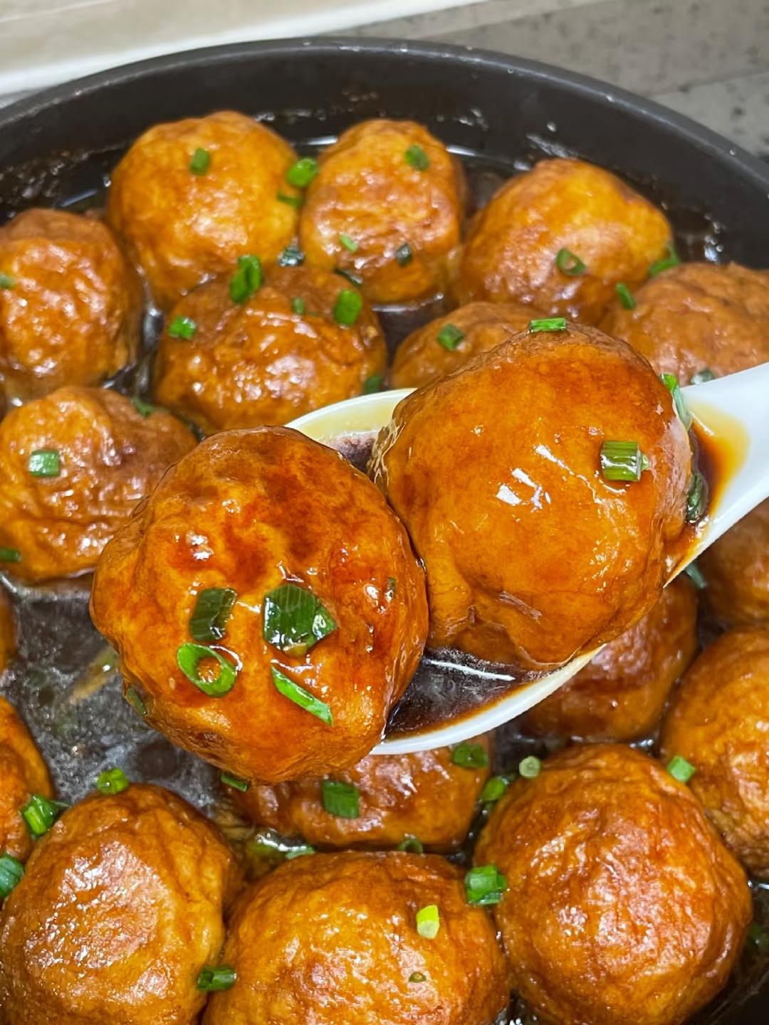 淀粉水搅匀后倒入锅里,大火收汁到浓稠,撒点葱花就大功告成!