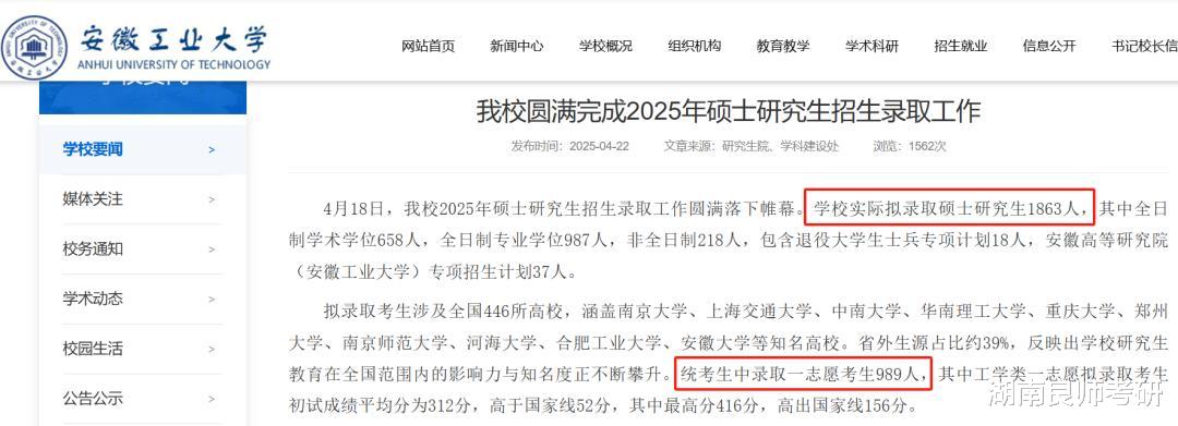 学校实际拟录取硕士研究生1863人。统考生中录取一志愿考生989人,一志愿录取人数占总录取的53.09%。