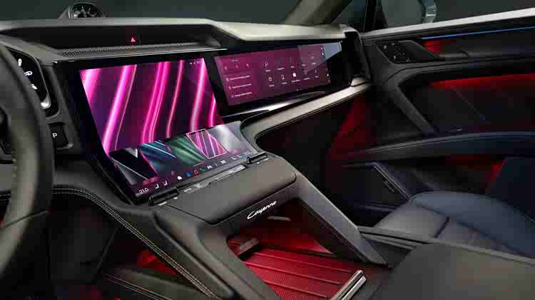 而内饰的改变也更为科技,纯电版Cayenne搭载了 “Flow Display” 曲面 OLED 屏幕,不仅是一块显示面板,更是保时捷对未来车载交互的全新诠释,垂直安装的曲面屏打破了传统车载屏幕的方正框架,底部以柔和的弧度自然弯折,巧妙地将屏幕划分为上下两个功能区:上方是始终处于驾驶员视野范围内的显示区,可实时呈现驾驶模式、续航里程、导航路线等核心信息,避免驾驶员分心;下方则是操控区,配合与屏幕弧度同步适配的菜单界面。