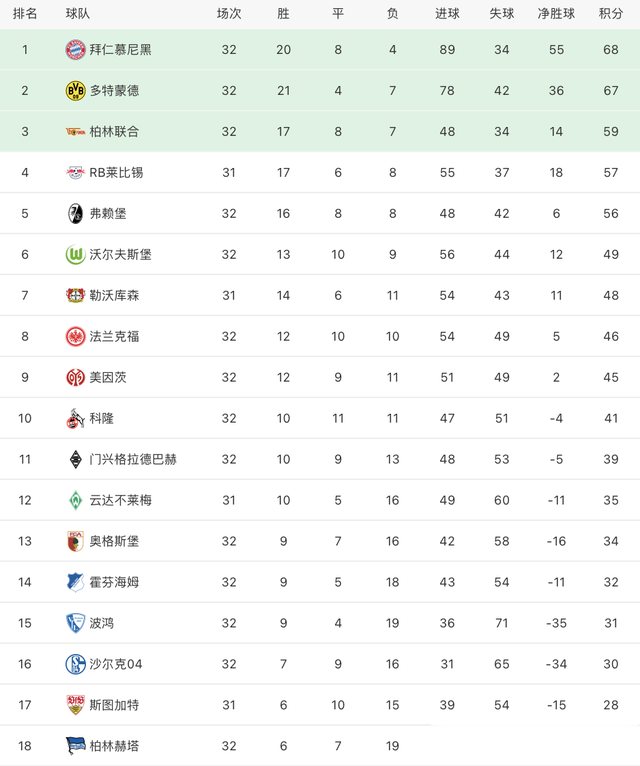 其他比赛中,柏林联合主场4-2击败弗赖堡,升至积分榜第3位,贝克尔贡献2射2传;法兰克福主场3-0击败美因茨,镰田大地传射建功;沃尔夫斯堡主场2-1击败霍芬海姆,升至积分榜第6位;波鸿主场3-2击败奥格斯堡,摆脱了降级区。