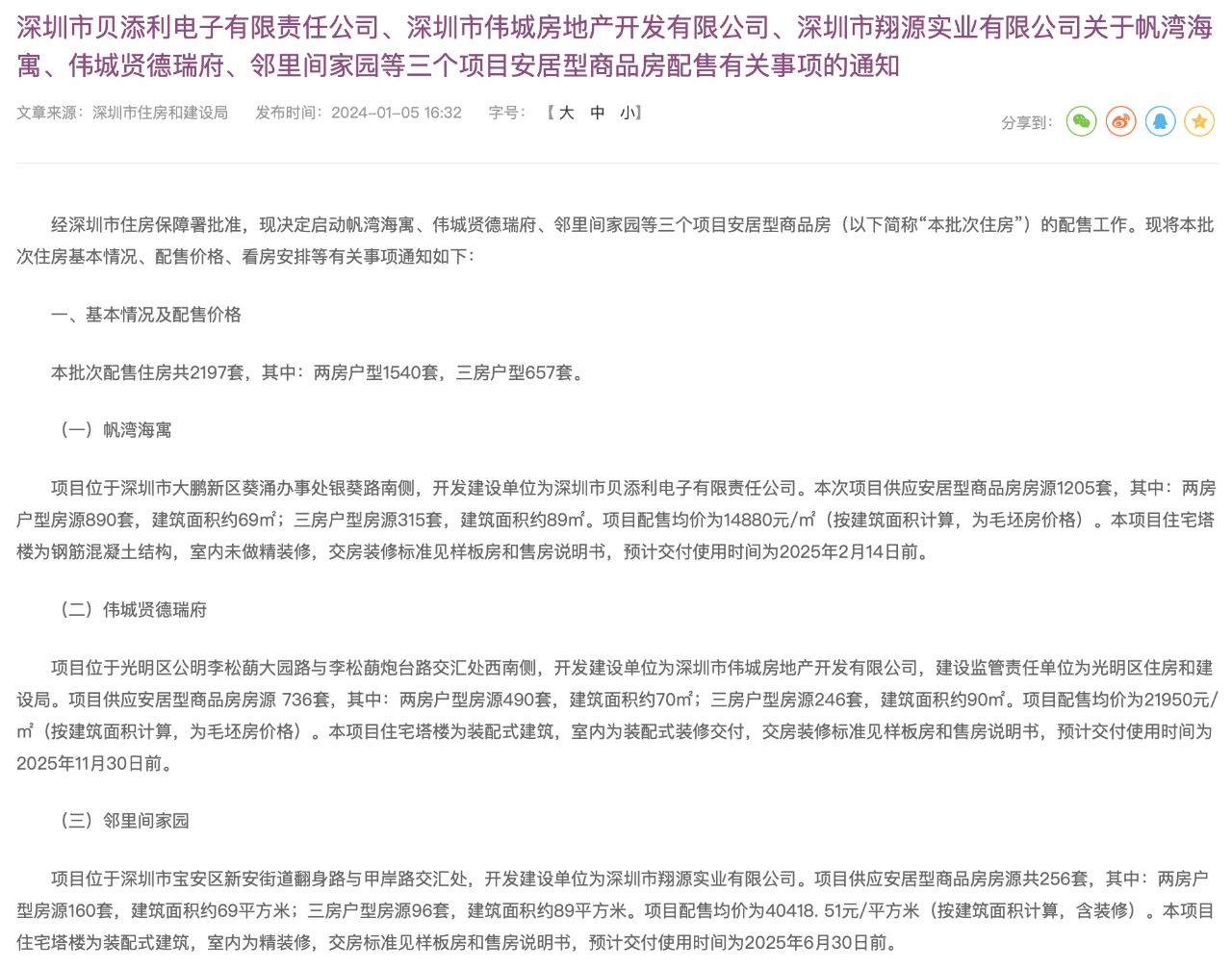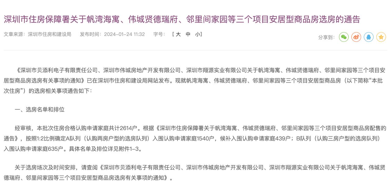 深圳安居型商品房帆湾海寓、伟城贤德瑞府、邻里间家园申购名单公布! 合格认购申请家庭共计2614户,其中2房1979户、3房635户。总房源2197套,其他2房1540套、3房657套。大鹏帆湾海寓有1205套,预计会卖不完了。 大鹏帆湾海寓均价14880元,同片区商品房价格的5折,满10年就能申请完全产权,这样的深圳房价还算高吗?