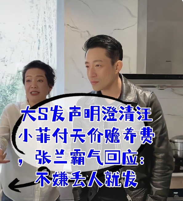 大S发声明澄清汪小菲付天价赡养费,张兰霸气回应:不嫌丢人就发! 又发什么声明发去吧,发什么声明了,不嫌丢人就发呗啊,丢人现眼,近日,塔媒曝光了大S与汪小菲的离婚协议,两人自离婚后,汪小菲已经支付大S四千五百万,并且直到2038年3月,汪小菲还要每个月给大S抚养费100万。1月24日,大S方发声明回应网传离婚协议,称网上恶意夸大的金额大S并没有收取,喊话大家不要以讹传讹。当天,汪小菲的母亲张兰在直播时被问到大S发声明一事,称又发声明了,天天声明,不嫌丢人就发呗,接着还骂了一句脏话。接着张兰暗讽大S君子爱财,取之有道,善良一点好吗?对于张兰的回应,网友纷纷表示,果然还得是张兰呀,一点面子都不给留,张嘴就骂钱儿媳不过。对的,没毛病。据悉,汪小菲每次被前妻大S给欺负后,张兰必定会直播怒骂大S为儿子。