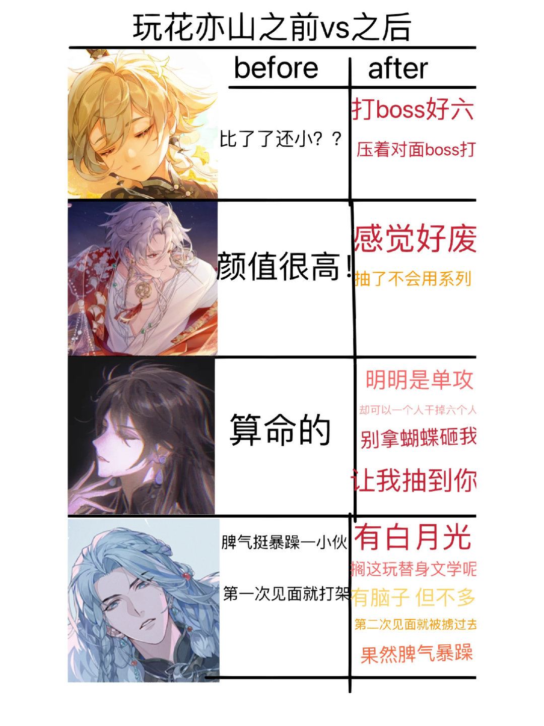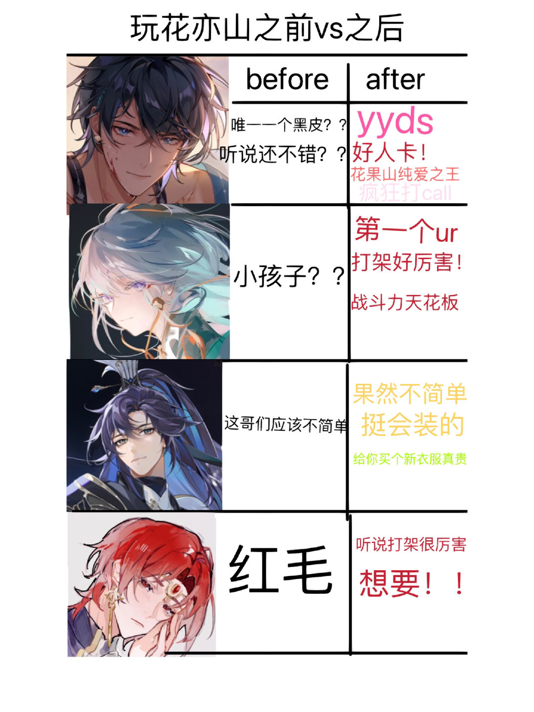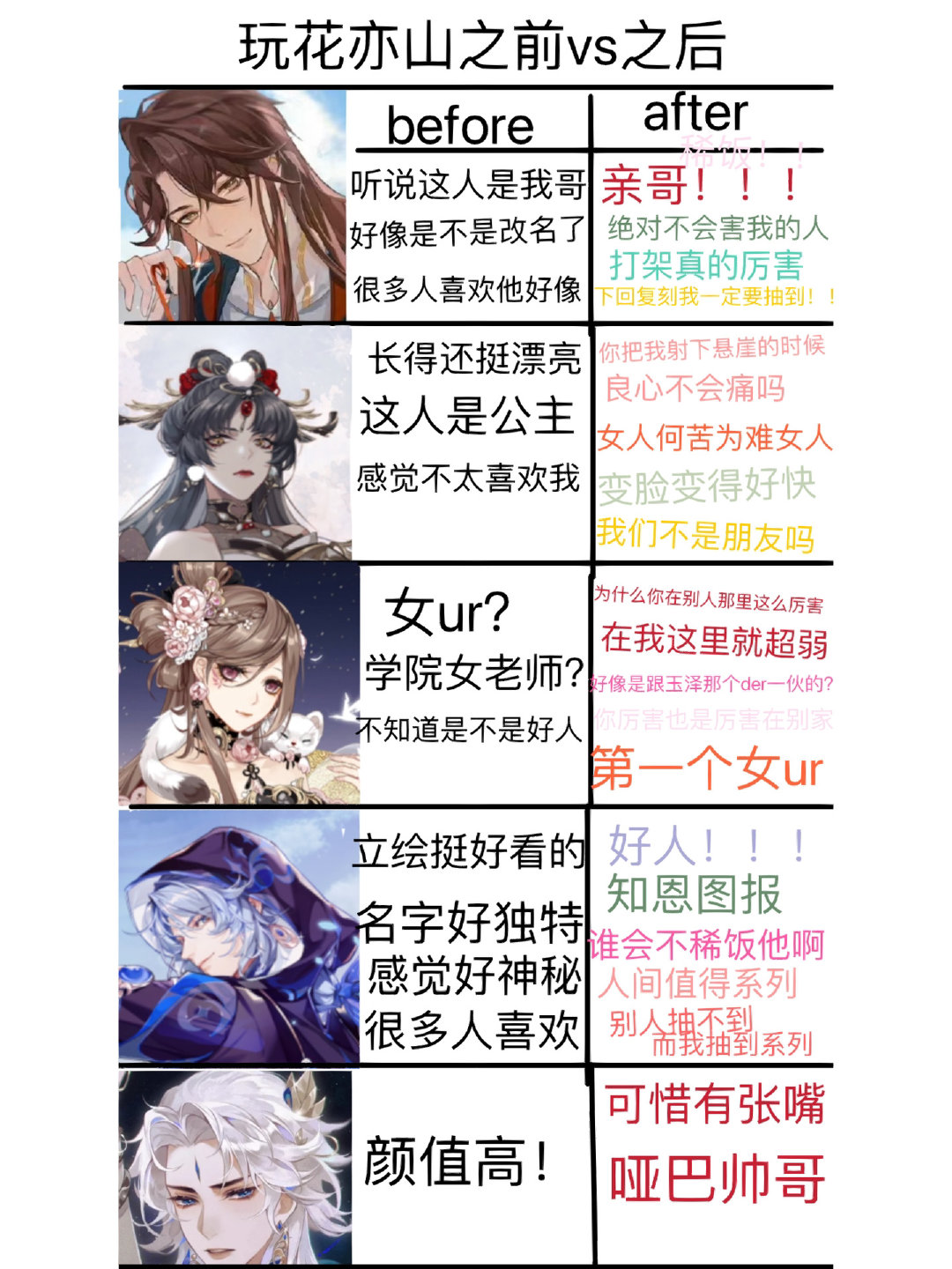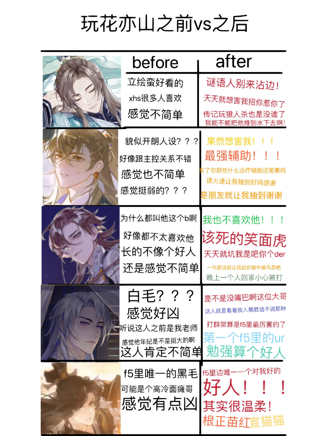 玩花亦山之前vs之后对众人印象[偷笑]