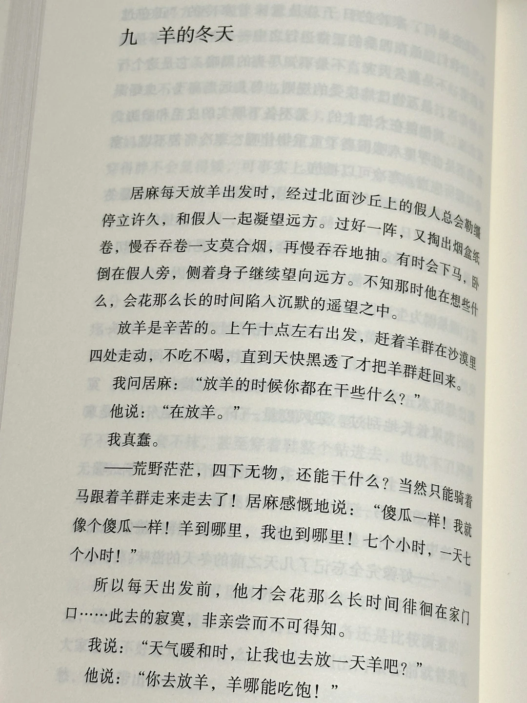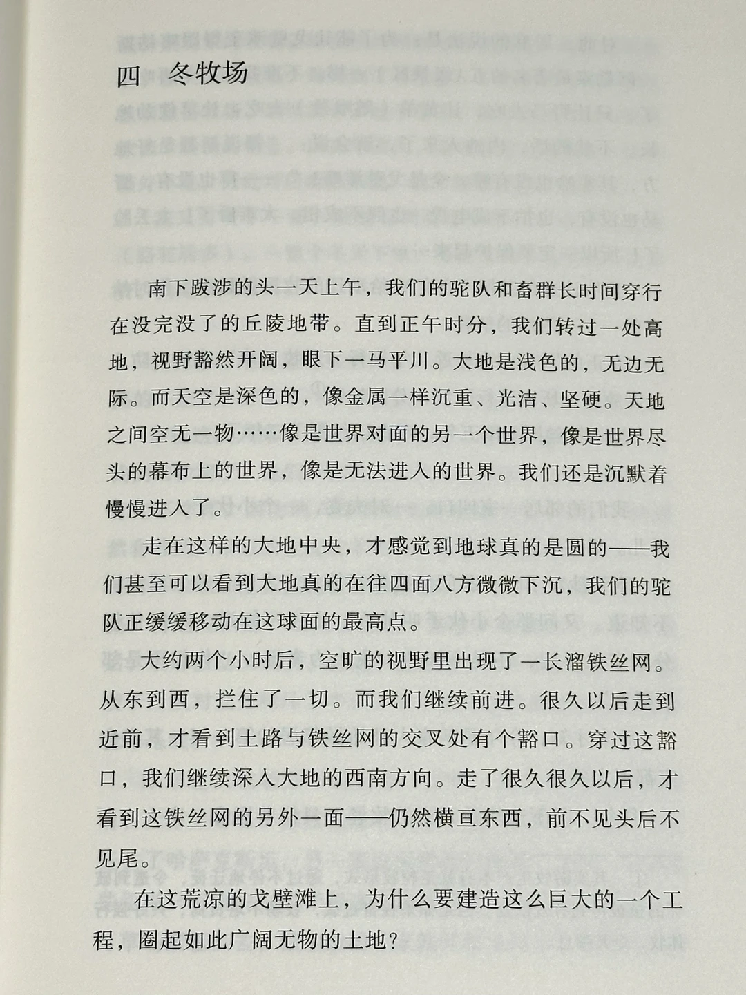 “春天接羔,夏天催膘,秋天配种,冬天孕育。羊的一生是牧人的一年,牧人的一生呢?这绵延千里的家园,这些大地最隐秘微小的褶皱,这每一处最狭小脆弱的栖身之地……青春啊,财富啊,爱情啊,希望啊,全都默默无声。”