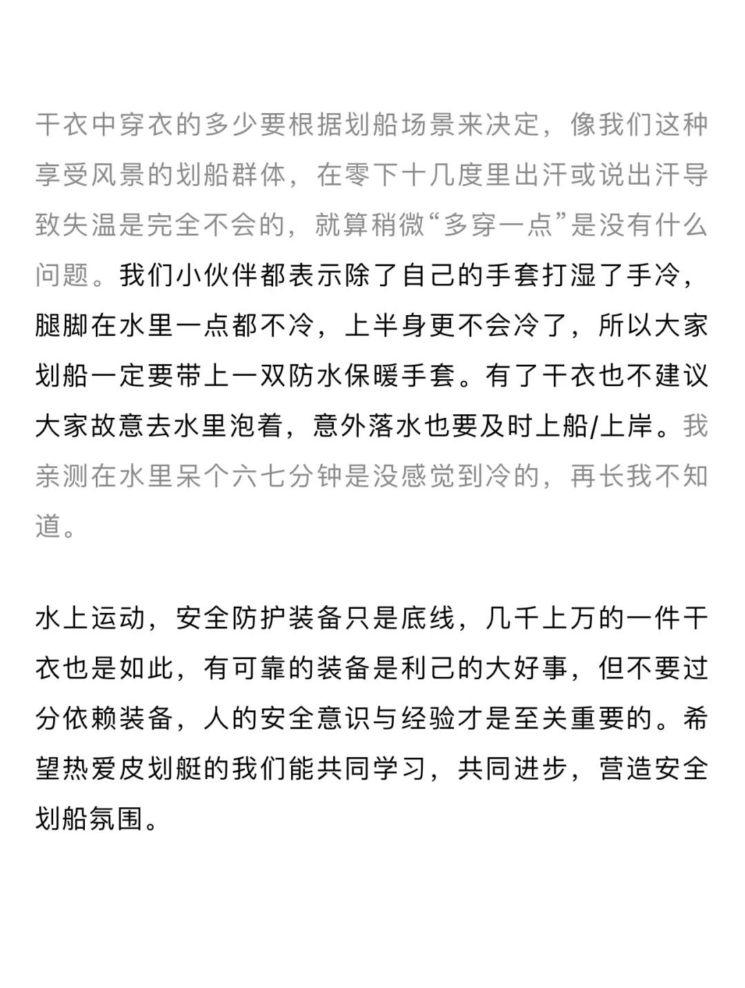 在冬季你所穿的保暖衣物在同地点的岸上不冷,那你玩船几乎也不会冷,掉水里更不会冷了。以我们玩船的环境举例,冬季环境温度在零下5-20度,很多朋友认为就算穿干衣掉水里不被冷S也是冻懵逼的节奏。但在自然界中水只要是液态的,那水中温度只能是在0度及以上,所以你穿着能抵御零下十几度的衣物,在零上的水中还会冷吗?因为干衣可以全身防水所以不会打湿衣物,也就不会造成失温,就如同你在零下十几度的户外到了零上的房间中一样,可能不太恰当但你们能大概理解就行。还有,可靠的装备能给你带来内心的安全感,出现意外时的慌乱紧张也是威胁生命安全重要因素之一。