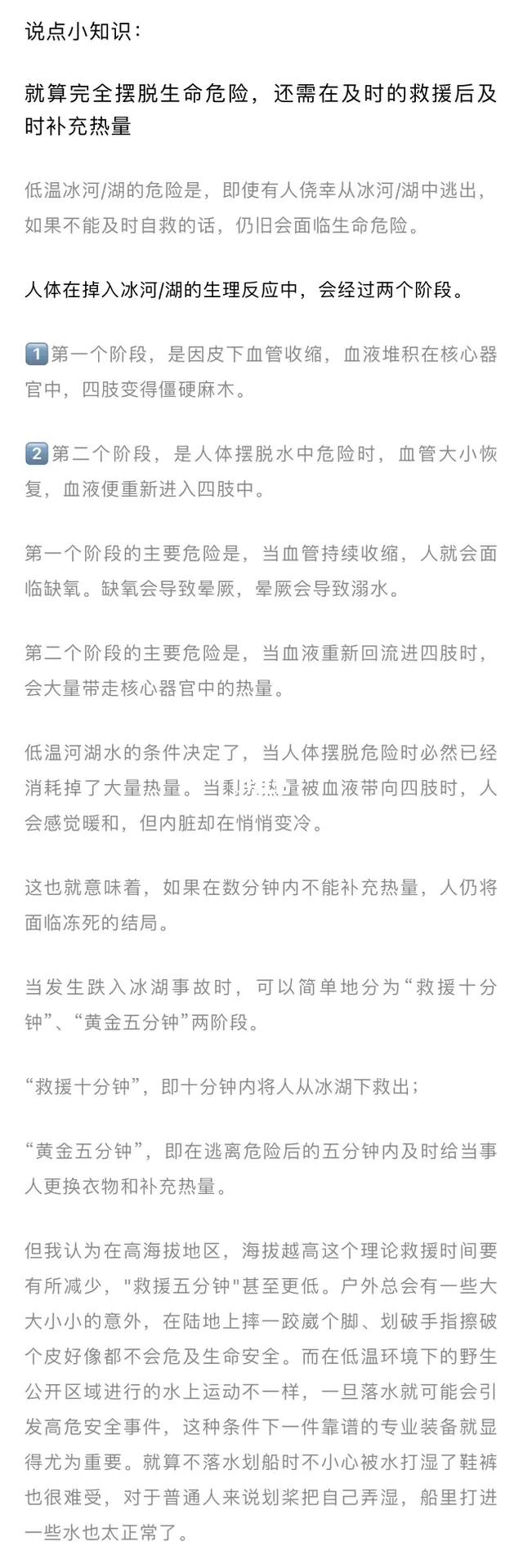 冬季在高海拔地区玩船(野外,非景区),如果没穿干衣意外落水,1分钟内不能上岸/上船并未及时更换衣物、补充热量,那风险是很大的(只针对意外落水),超过5分钟不能上岸/上船,并未及时更换衣物补充热量,那会无限接近SW。意外落水人还会感受到一种极强的恐慌感,这种恐慌感会使得人体的心跳加速,使人难以自如控制身体并有猝死的风险,加上高海拔空气稀薄会使情况更为糟糕。这也就意味着,即使在最初1-2分钟内,因为恐慌感的出现也无限增加了风险