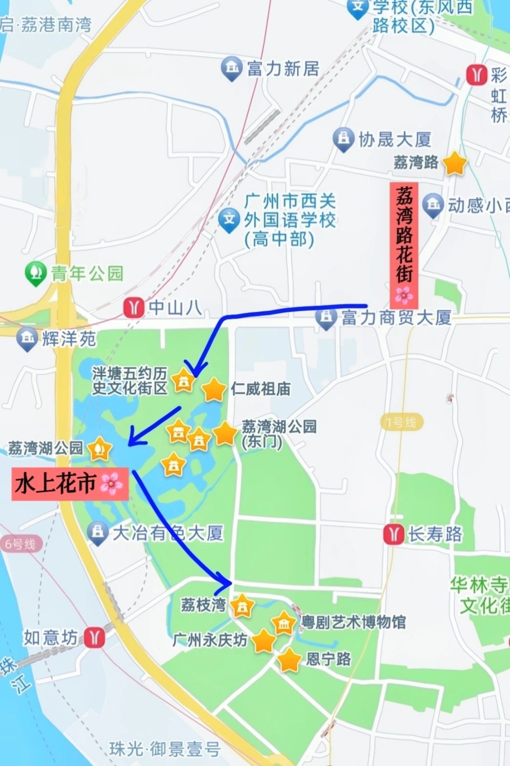 线路推荐:荔湾路(新春花街)➠ 泮塘五约古村➠ 荔湾湖公园(水上花市)➠ 荔枝湾➠ 粤剧博物馆➠ 永庆坊➠ 恩宁路