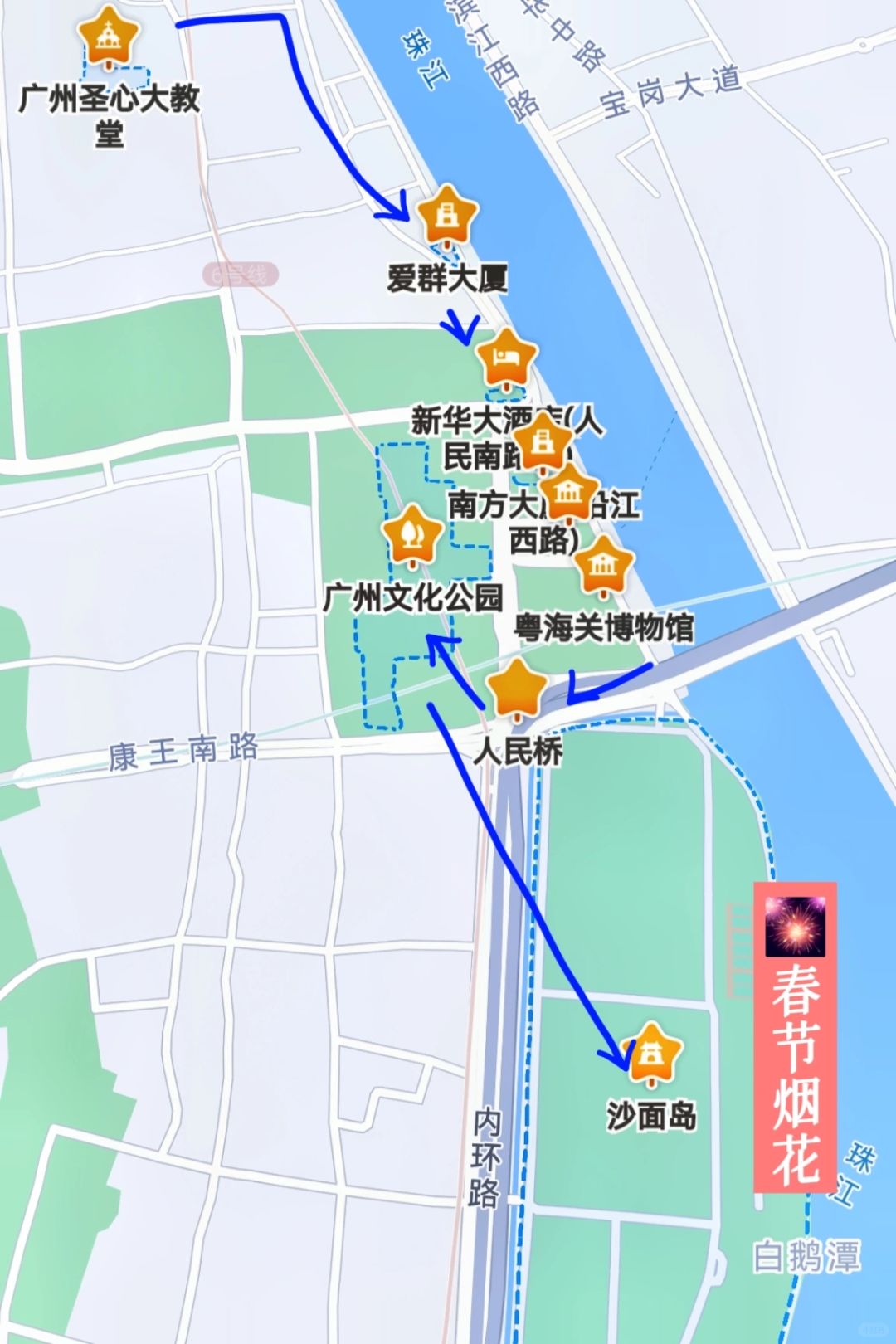 线路推荐:圣心大教堂➠ 爱群大厦➠ 新华大酒店➠ 南方大厦➠ 邮政博物馆➠ 粤海关➠ 人民桥➠广州文化公园(迎春花会和元宵灯会)➠ 沙面岛(白鹅潭春节烟火)