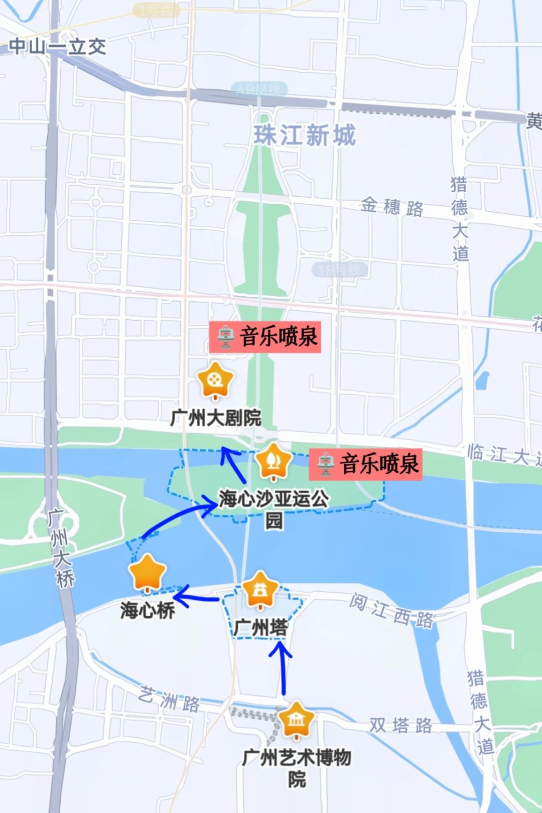 推荐路线:广州艺术博物馆➠ 广州塔➠ 海心桥➠ 海心沙➠ 广州大剧院