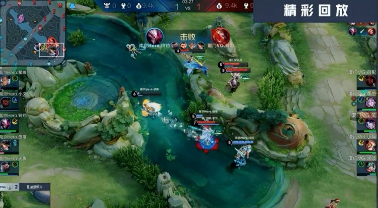 [12:32]领导在河道被抓,海月拉达摩进圈将其击杀,小年黄忠锋芒毕露,厦门VG打出0换2直接一波推平南京HERO基地拿到比赛胜利。