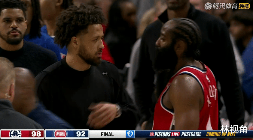 哈登留在场上和活塞球员拥抱致意,康宁汉姆走入场内,一把抱住哈登,两位持球大核亲切拥抱,之后又聊了起来,看起来两人关系不错。