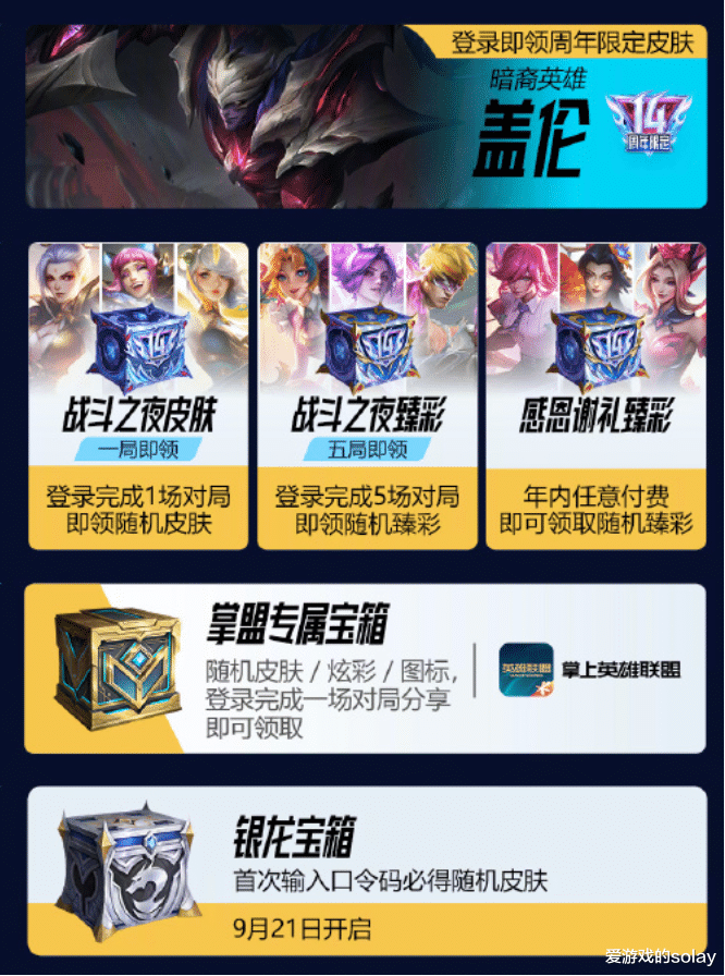 今年的福利可真的是相当的给力!活动期间一共可以领到三款皮肤和一款臻彩,这可是从未有过的高规格福利啊,除了登陆就送的“暗裔英雄 盖伦”,在活动期内完成任务更可以再获得臻彩皮肤,更有口令宝箱、感恩臻彩皮肤、阿卡丽的黑金商店、网吧福利等等等多样福利拿到手软,错过了可真就亏大了!