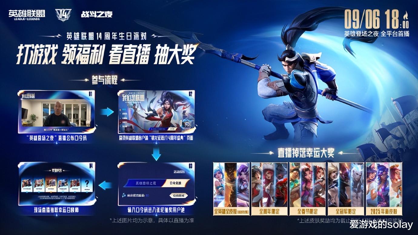 家人们!LOL14 周年庆开启,生日会没尽兴的必冲 —— 文化、情怀、快乐、福利全有!期待新名场面与新锦鲤的诞生!9 月 6 日 “英雄登场之夜” 全网直播,重温情怀、蹲明星、看梗王、薅皮肤都别错过,快约好友共赴狂欢,让热爱继续绽放!