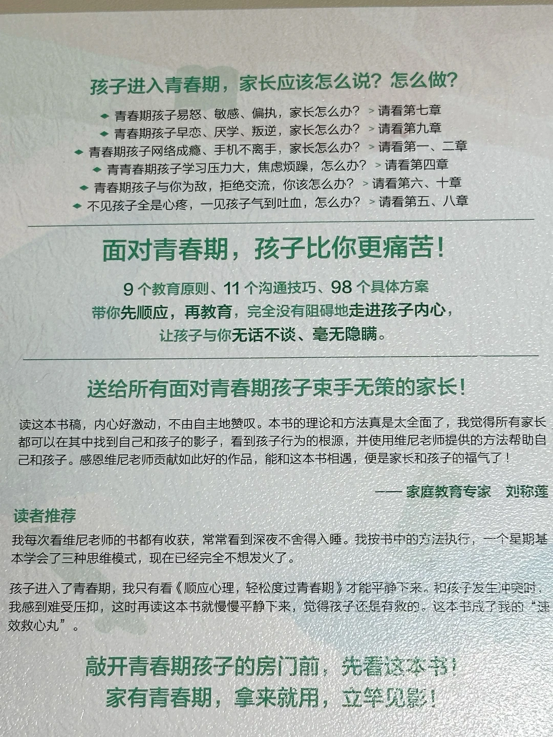 在本书中,维尼老师像唠家常一样传达了顺应心理的本质、思维和实施方法,通过 9 个教育原则、11 个沟通技巧、98 个具体方案教家长积极解决青春期孩子易怒、敏感、早恋、网络成瘾、学习压力大等问题。