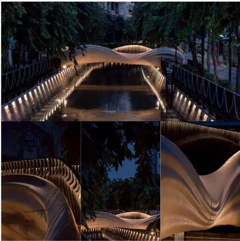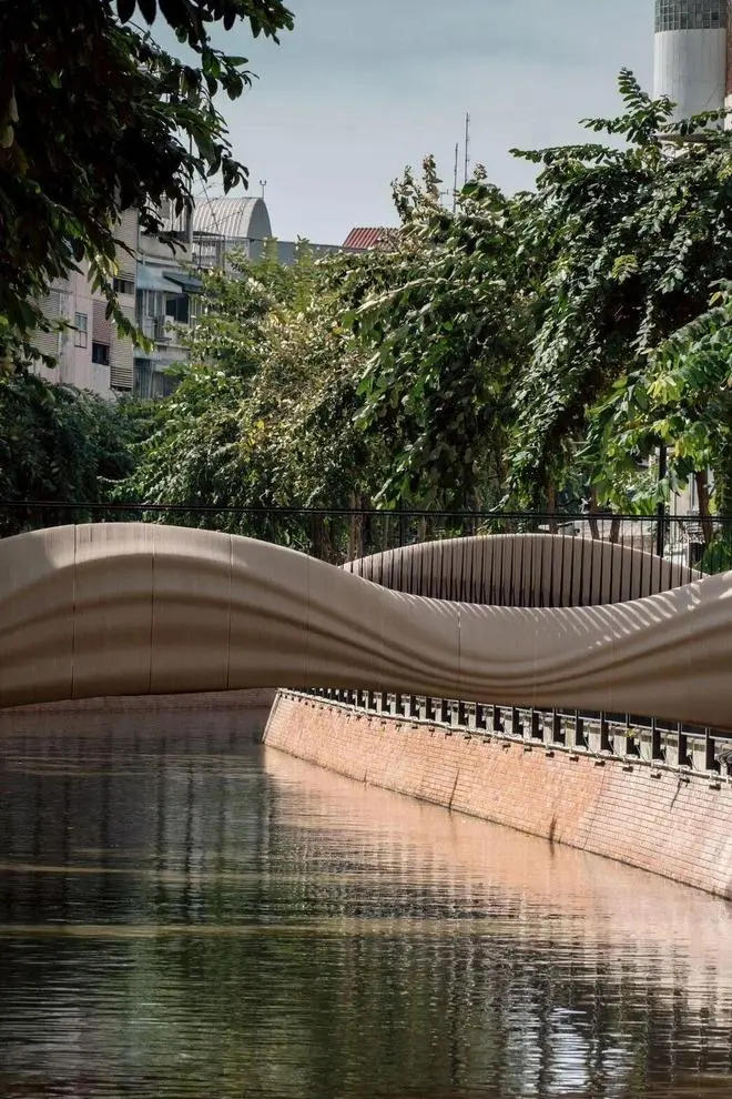 桥梁采用数字化设计,这种流畅的造型和连续的曲线呼应了运河的自然韵律,光影在起伏的桥面上变幻莫测。