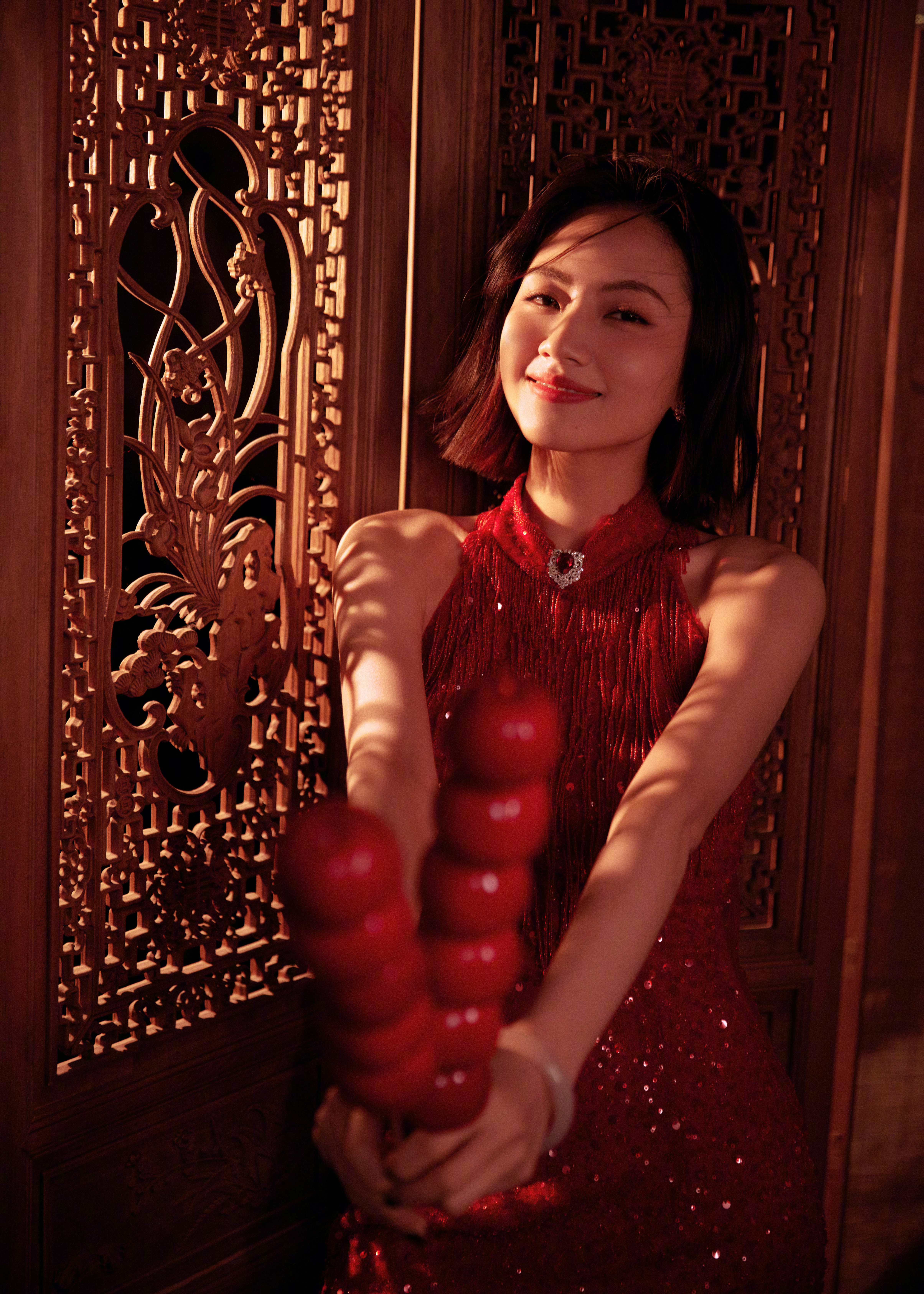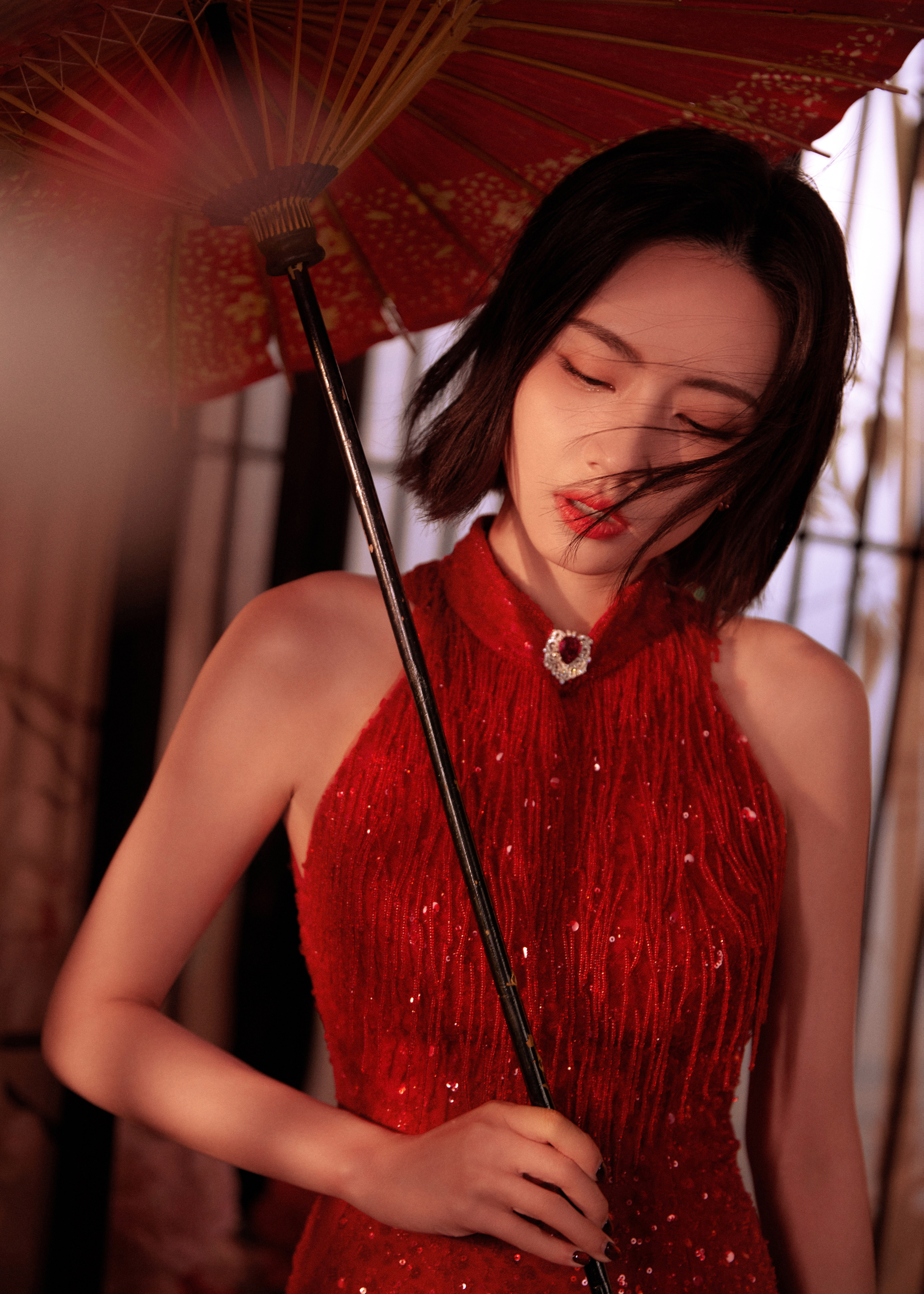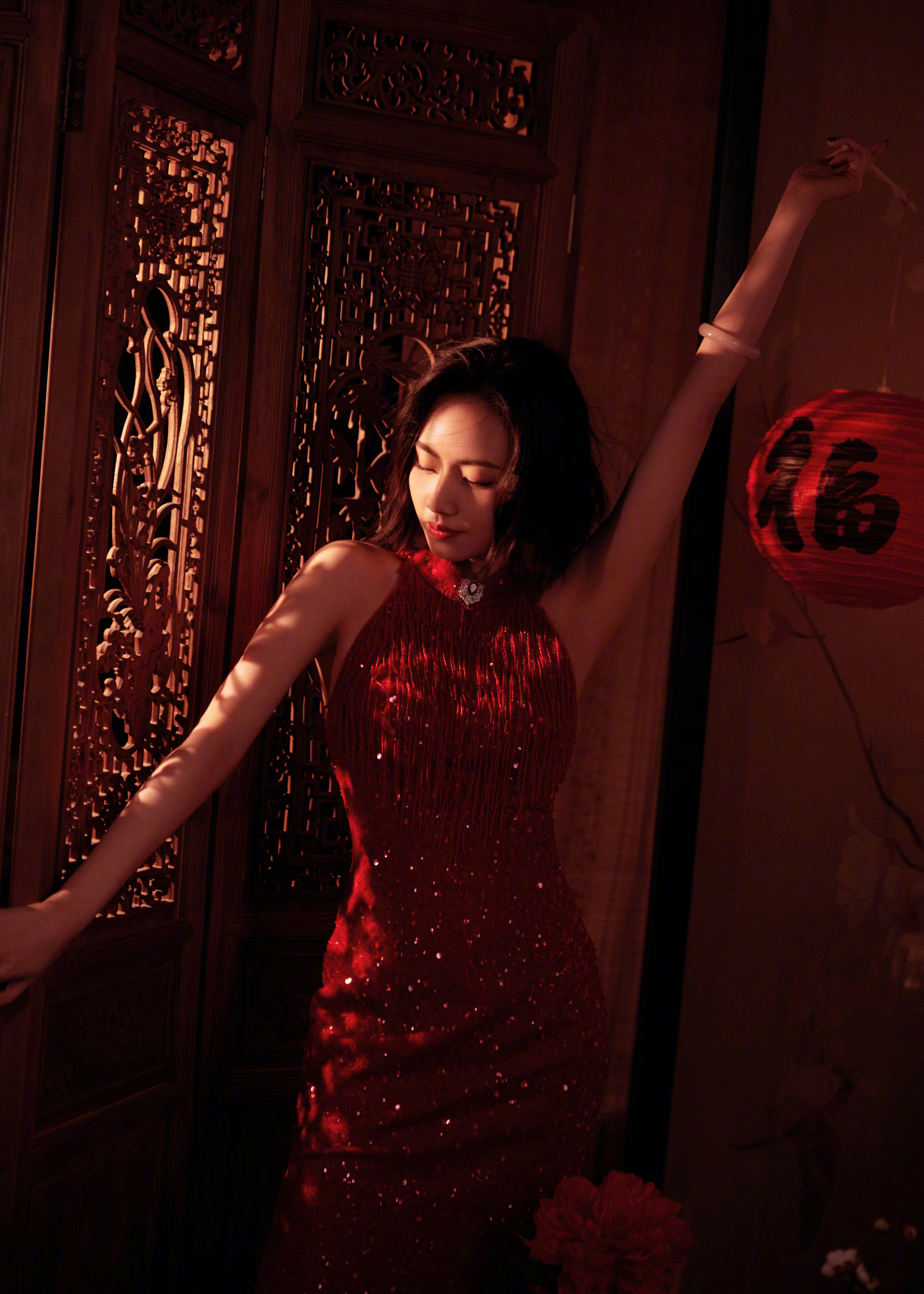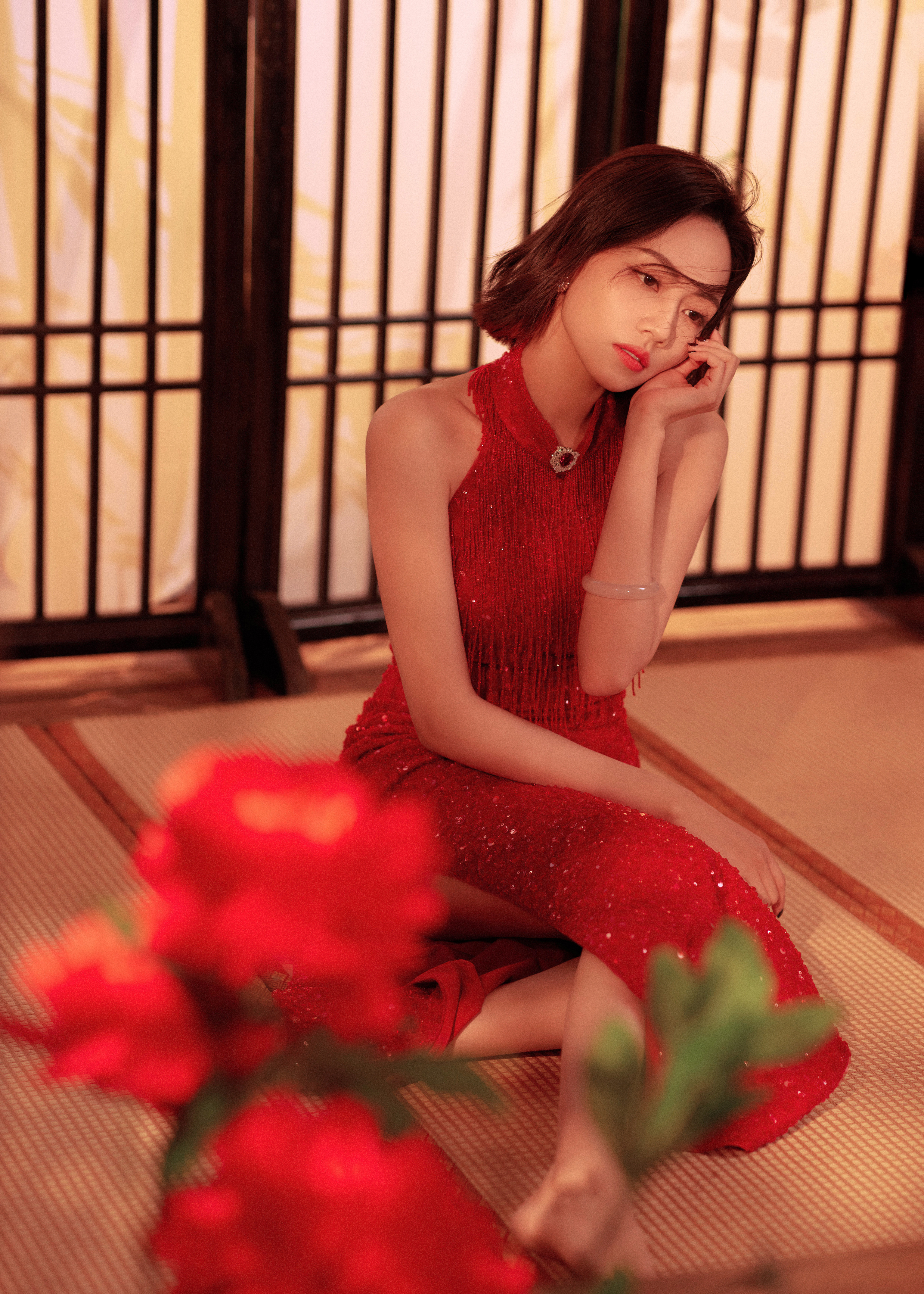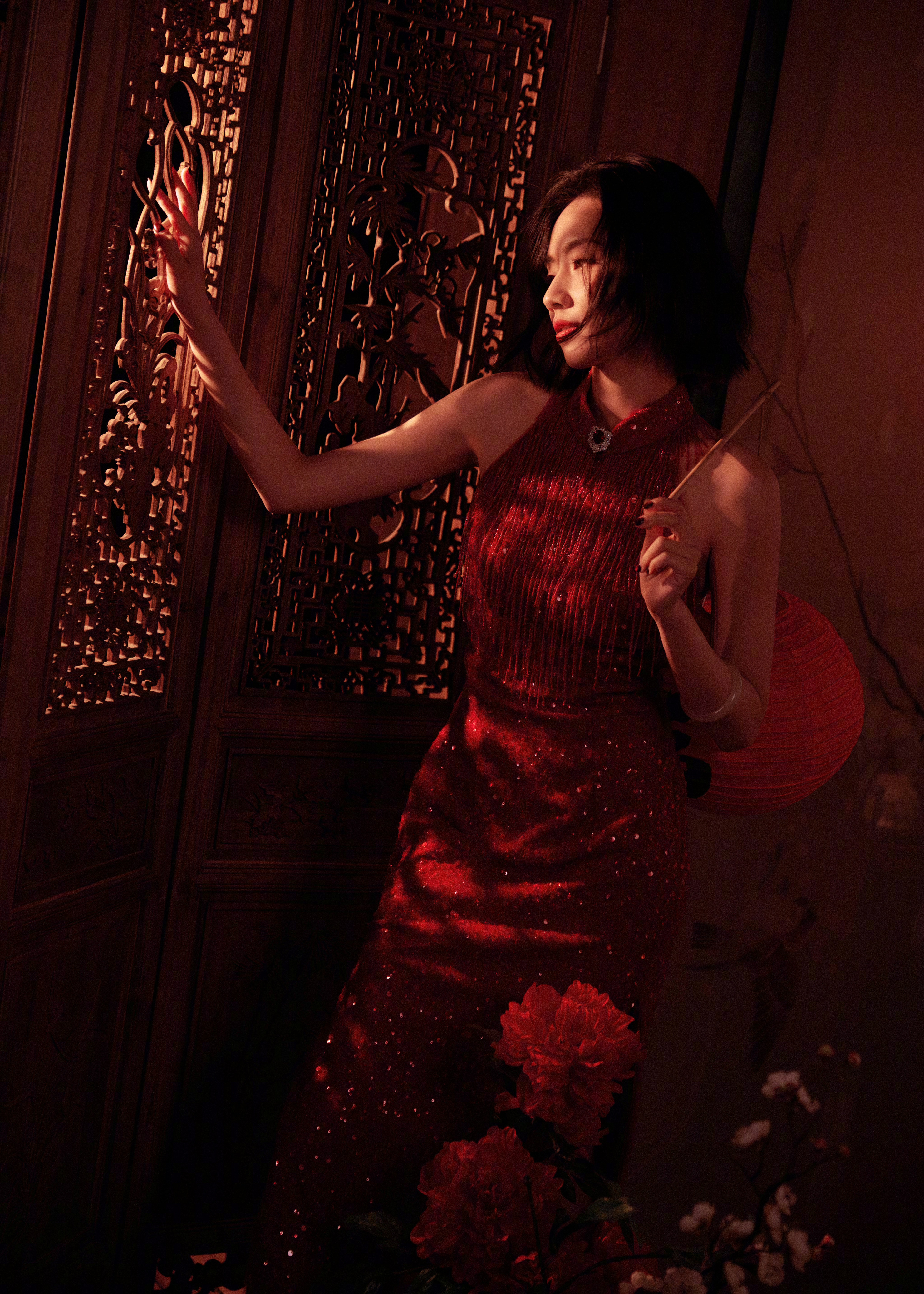 刘惜君 身穿红色长裙,宛如一幅画中的仙子,静静地站在窗前,头戴红色饰品,宛如夏日