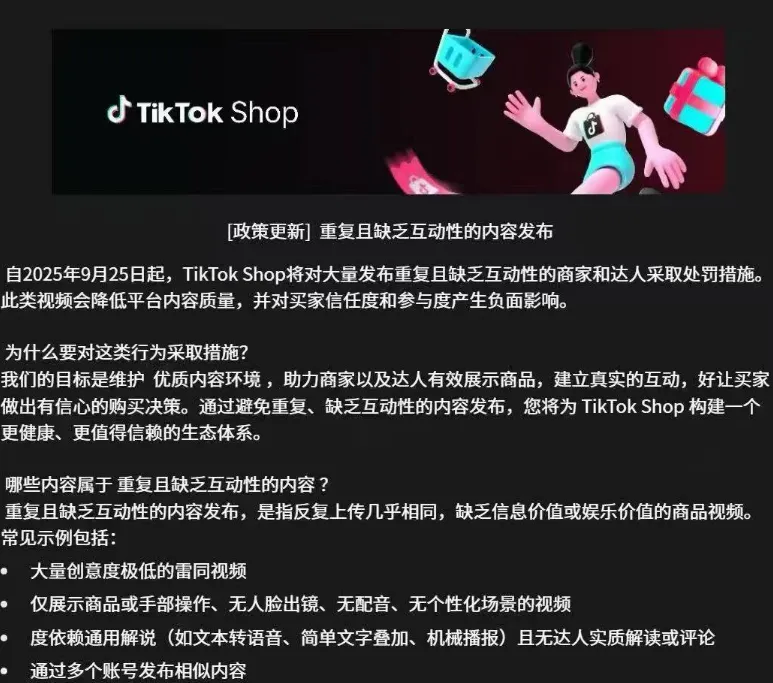 自2025年9月25日起,TikTok Shop对大量发布重复且缺乏互动性内容的商家和达人实施处罚措施,许多靠“批量发布、多账号铺量”的卖家突然发现流量大幅下滑,有的甚至账号被封。