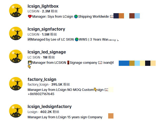 @lcsign_lightbox、@lcsign_signfactory、@lcsign_led_signage……每个账号都有不同人设、不同内容风格,共同覆盖不同细分人群。