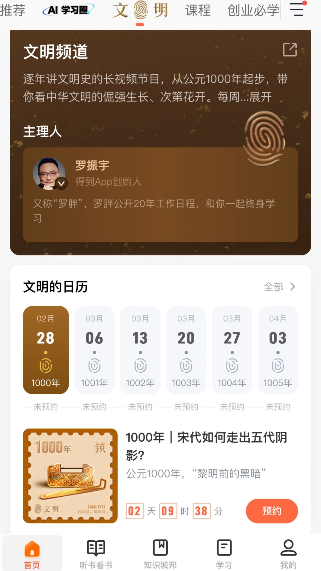 🔖在读过的众多书籍中,文化历史类一直是我的最爱。除了读纸质书,在得到APP上听书也是我在碎片时间“解馋”的一大法宝。在昨天习惯性打开得到APP准备听书时,发现多出了一个名为“文明”的板块。好奇心驱使下,我点进详情页,项目介绍令我大吃一惊,罗胖这次竟然要做一个长达20年的历史文化工程‼️