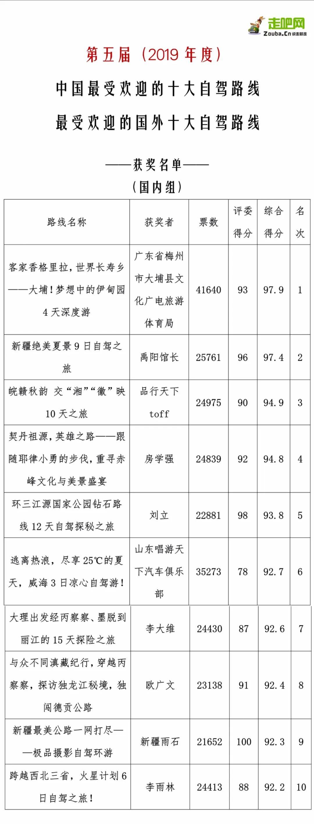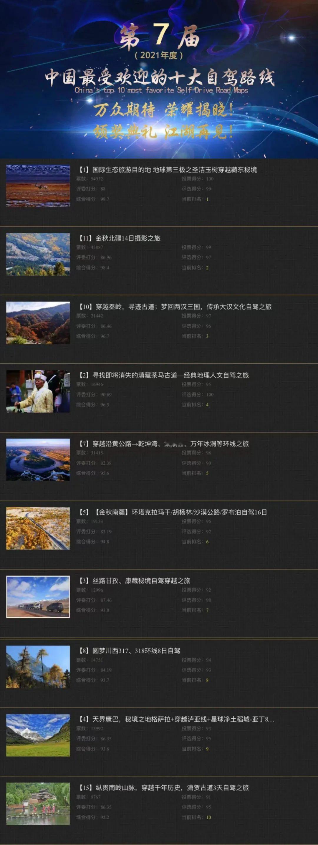 带上你的自驾路线来投稿! 上榜将获免费旅游! [中国赞][加油]第九届(2023年度)中国深受欢迎的十大自驾路线评选开始啦! 【奖项设置】 1、中国深受欢迎的十大自驾路线一等奖一名(第一名); 2、中国深受欢迎的十大自驾路线二等奖一名(第二名); 3、中国深受欢迎的十大自驾路线三等奖一名(第三名); 4、中国深受欢迎的十大自驾路线优秀奖七名(第四至第十名); 注意:入选“中国深受欢迎的十大自驾路线”获奖选手免费参加颁奖典礼及承办地落地自驾体验活动。 (活动时间地点以走吧网通知为准,颁奖典礼日期确定将向获奖人员发出颁奖典礼邀请函等)。 【征稿时间及对象】 一、征稿时间为:2024年1月3日—2024年3月31日 二、参与对象: 1、全国自驾爱好者、自驾俱乐部、自驾达人等 2、旅游目的地主管部门、景区等 3、旅行服务机构、旅行社等 全网公开征集最特色、最实用的国内自驾路线 #走吧自驾去旅行##生活大咖团#
