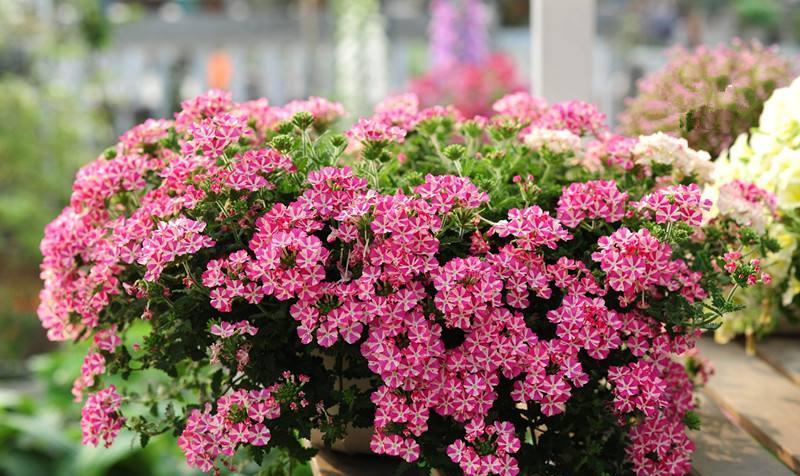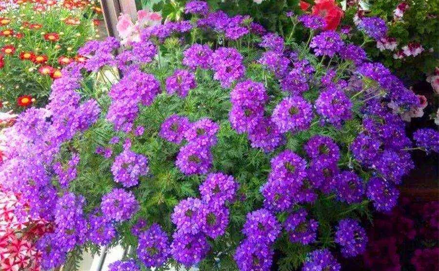 可播种一些“草花皇后”——美人樱 【简介】:美人樱也叫美女樱、草五色梅,它属于马鞭草科多年生草本植物,自然花期5- ,它既可以作为庭院、公园以及绿化带的地被草花大面积进行片植也可以盆栽。它的叶片细密而轻盈,盛花期花朵繁茂,伞状花序盛开如同绣球状,观赏性非常好! 【习性】:美人樱喜阳光充足、温暖湿润的环境,虽然不耐寒,但是比较耐热,夏秋两季是其盛花期。对土壤的要求不严,一般的园土、腐殖土就能生长得很繁茂。 【播种】:播种美人樱适宜在3- 份进行,由于其种子发芽率相对较低,播种前可用35℃温水浸泡一天用于催芽,能提高其发芽率。过滤水分后,取少许的基质将种子混合其中充分拌匀再进行播撒,有利于控制好适宜的播种密度,播撒完后覆上2-3CM的土,用喷雾喷施土壤至微潮的状态,一般2周左右即可发芽。 【养护】:出芽后给予充足的光照,旺盛生长期适当进行摘心和打顶,能促进分枝,让盛花期的开花效果更繁茂。美人樱的花期很长,除夏季高温时期以外,可每半个月浇灌少许水溶肥或者每间隔2-3个月撒上一把颗粒缓释肥,它的花期就能持续绽放至深秋!