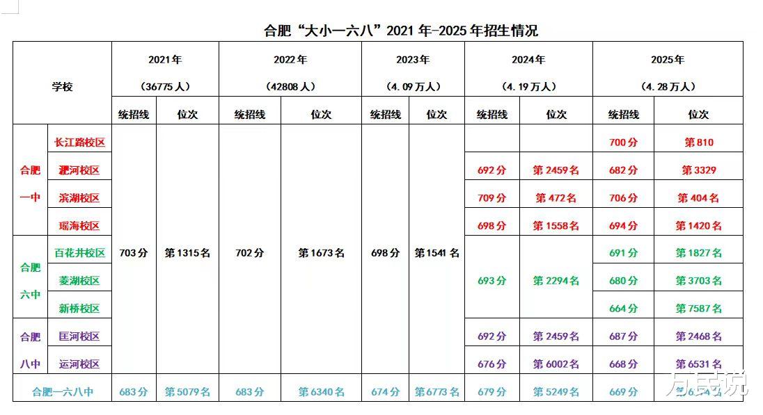 1.合肥一中滨湖校区:2025年统招位次404名,远超2021-2022年水平,成为扩招与取消联招的最大赢家,生源质量独占鳌头。