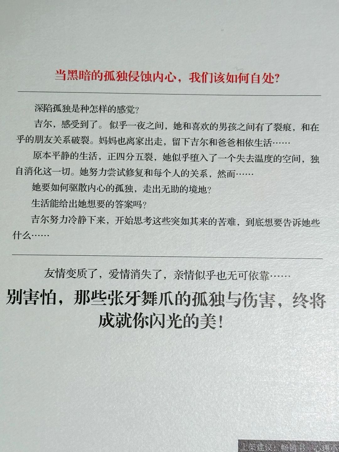 ▫️本书讲述了少女吉尔经历了生活中的伤痛之后,如何助人以及自助的故事。通过她的故事,让我们明白了,只有当自己的生活变得更好,才能修复他人的生活。