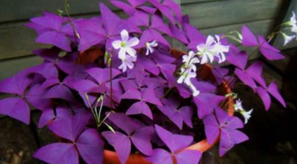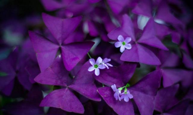 养盆紫叶酢浆草,观叶、赏花两不误 紫叶酢浆草也叫红花三叶草、紫叶幸运草,它属于酢浆草属多年生草本植物,根茎部带有小型鳞茎,叶丛生于基部,茎细软,掌形叶片如同紫色的三角状,叶片轻盈如同翩翩起舞的紫蝴蝶。 紫叶酢浆草属于酢浆草入门级品种,喜温暖湿润、阳光充足的环境,也可耐半阴,耐热性较好,但是不耐寒。由于其属于彩叶观赏植物、株形低矮,常被当作地被植物大面积片植于公园和庭院,以增加配色和层次感! 它也可盆栽,一般 播种繁殖或通过种球繁殖,自然花期5- ,花朵为粉紫色或粉白色的5瓣小花,而且具有阴湿环境下不开花或花朵闭合的特性。 紫叶酢浆草虽然可耐半阴,但是充足的光照有利于叶色深紫、叶色绚丽,长时间处于阴湿环境下植株生长瘦弱,叶色黯淡。 由于其不耐寒, 根茎以上的叶片会逐渐枯萎,鳞茎以宿根的方式过冬,但是需要注意的是越冬温度不宜低于5℃,否则 难以发芽;盆栽 也可移至温暖干燥处养护,让鳞茎原盆休眠即可。