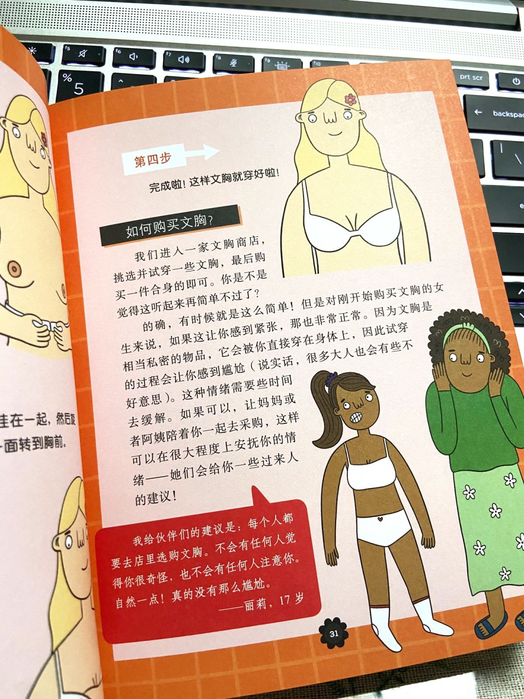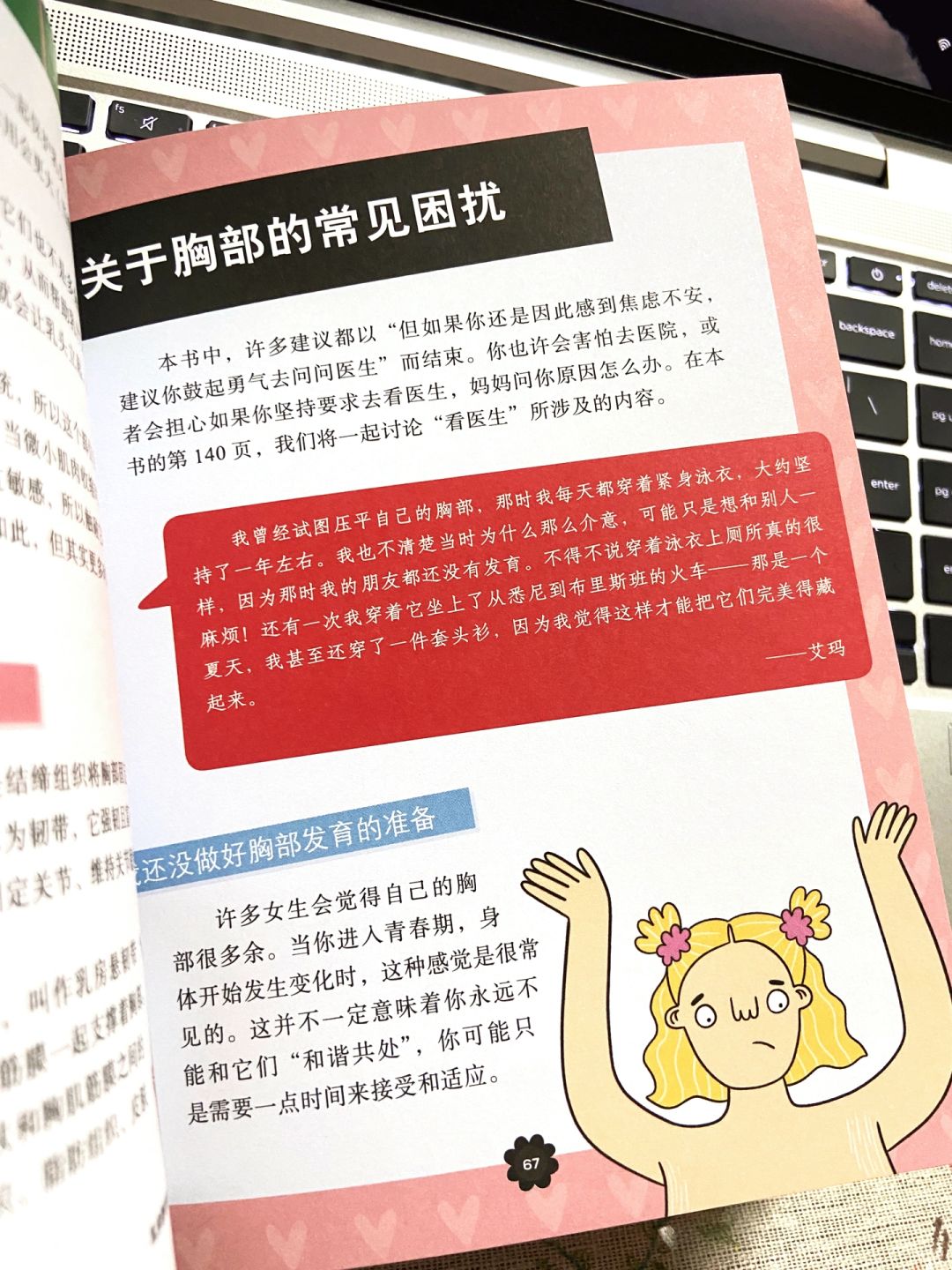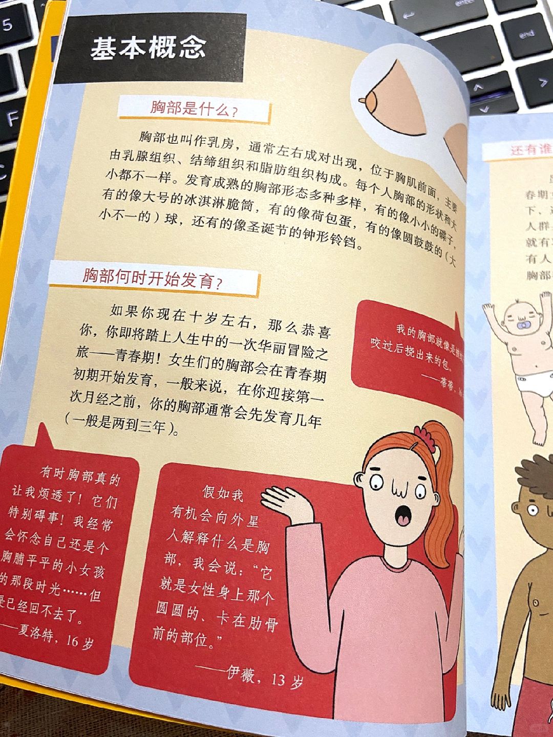 此外,书中后面部分不仅有来自世界不同地方女孩子们的真实举例,还分享了一些简单易懂的乳房健康知识,帮助女孩子们形成自检习惯,更好的保护自己的乳房。