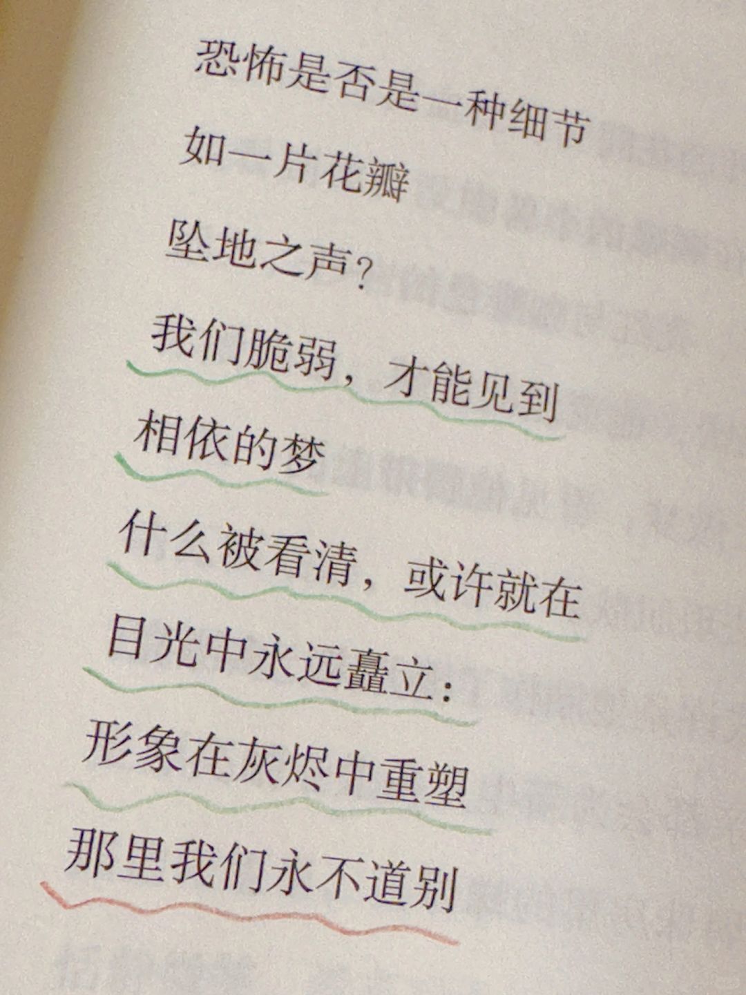 “我们脆弱,才能见到相依的梦,什么被看清,或许具在目光中永远矗立:形象在灰烬中重塑,那里我们永不道别。”
