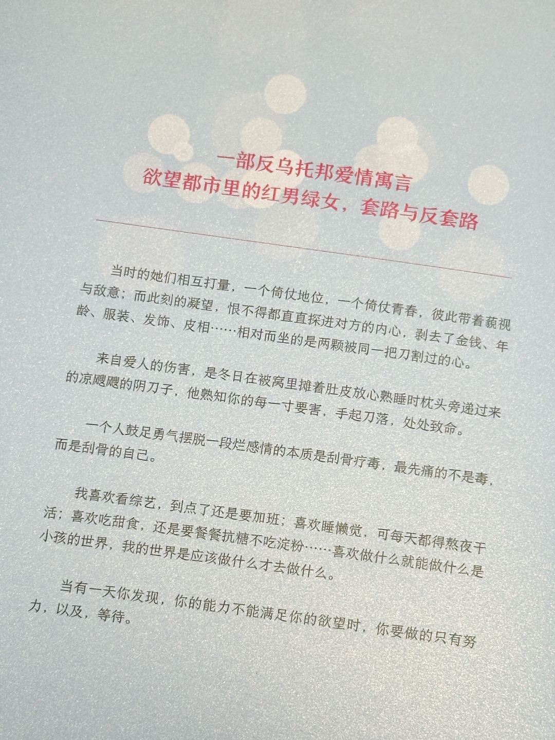 这是一个真实到令人发抖的反乌托邦爱情寓言。故事不长,却不简单,作者用近39万字写透了都市里灯红酒绿下,年轻男女之间的恩怨情仇。欲望、情爱、婚姻、利益、算计、套路、取舍...柳翠虎用娴熟的文字毫不遮掩地向我们揭露了迷离灯光下隐藏着的人性的复杂,也让我们能借助这个故事更加清晰地看到友情、爱情和婚姻的全貌。