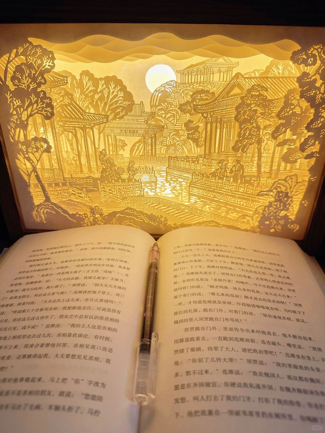 就像我最近刚刚为书桌添置的大观园纸雕灯,通过7层高透光纸片精巧叠加,完美展现了红楼梦中大观园内衡芜院、凸碧山庄、蒙风轩、凹晶馆和牡丹亭5处不同形式的建筑及以此为背景的不同人物活动场景,再配以可调节的柔和灯光照射,尽显层叠交错之美,组成一幅朦胧、温馨、浪漫的画面,令人沉迷其中,百看不厌。