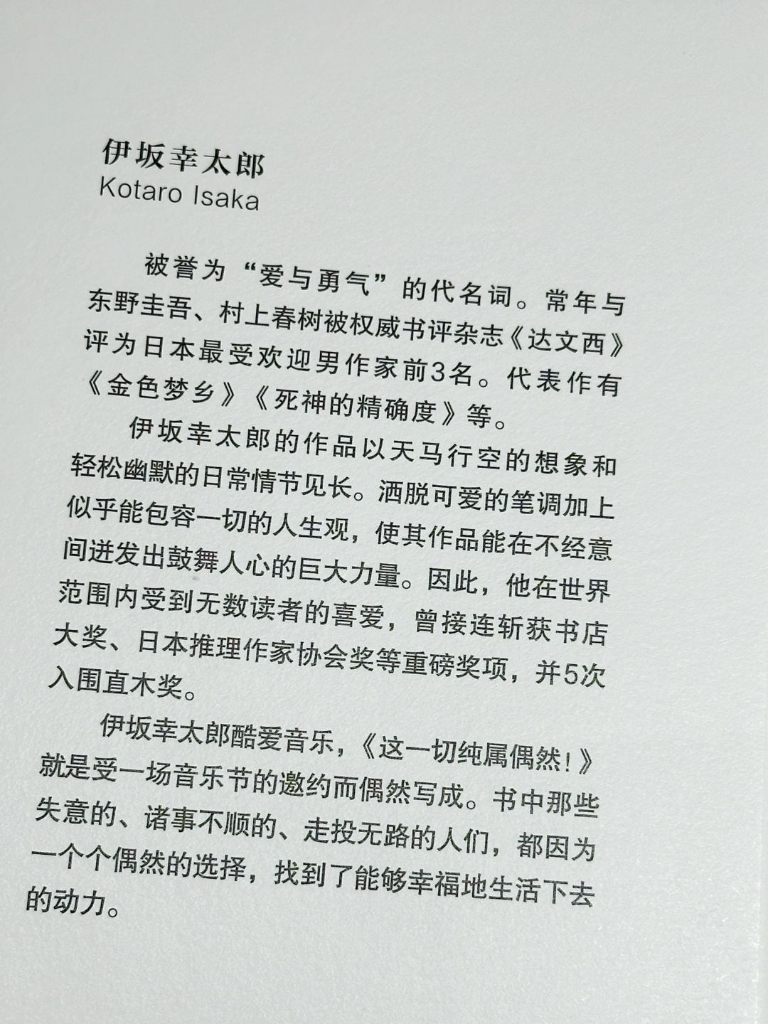 没想到第一次读伊坂幸太郎的书,就收获了这么大的惊喜!天马行空的想象、轻松幽默的日常、洒脱可爱的笔调,充满灵性的文字让人读来顿感清新爽利,仿佛一缕轻风略过浓雾笼罩的心头,长久积压的愤懑不安也随之消失不见。难怪他会被誉为“爱与勇气”的代名词!