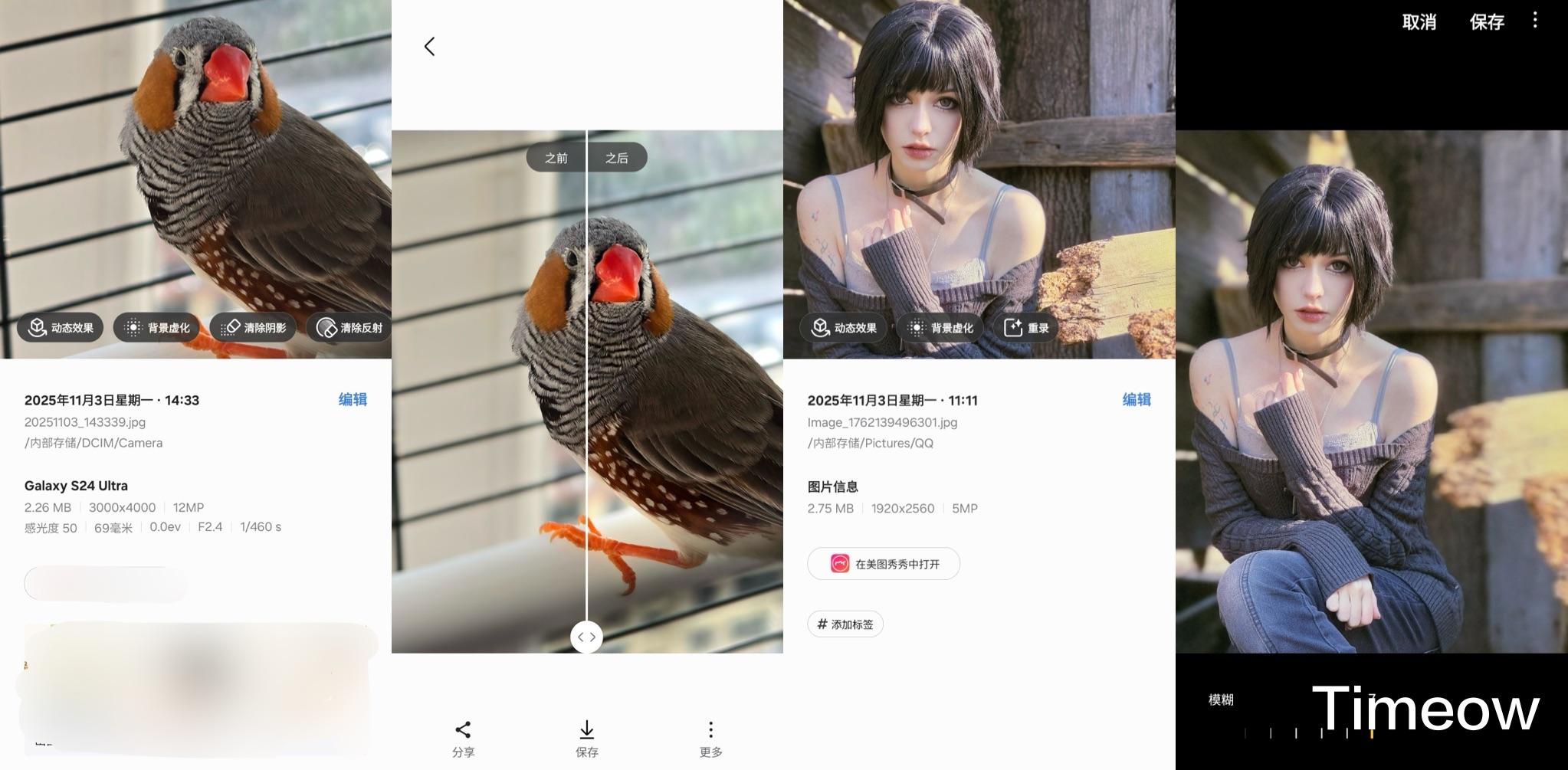 再比如“一键P图”,在相册里浏览照片时上划,就能自动出现AI“一键P图“的选项,可以一键去除反光/阴影、增加背景虚化程度等,还能自动优化色彩、亮度等,让照片更美,关键这些操作十分简单,不需要调整参数就能搞定,太适合普通用户了。