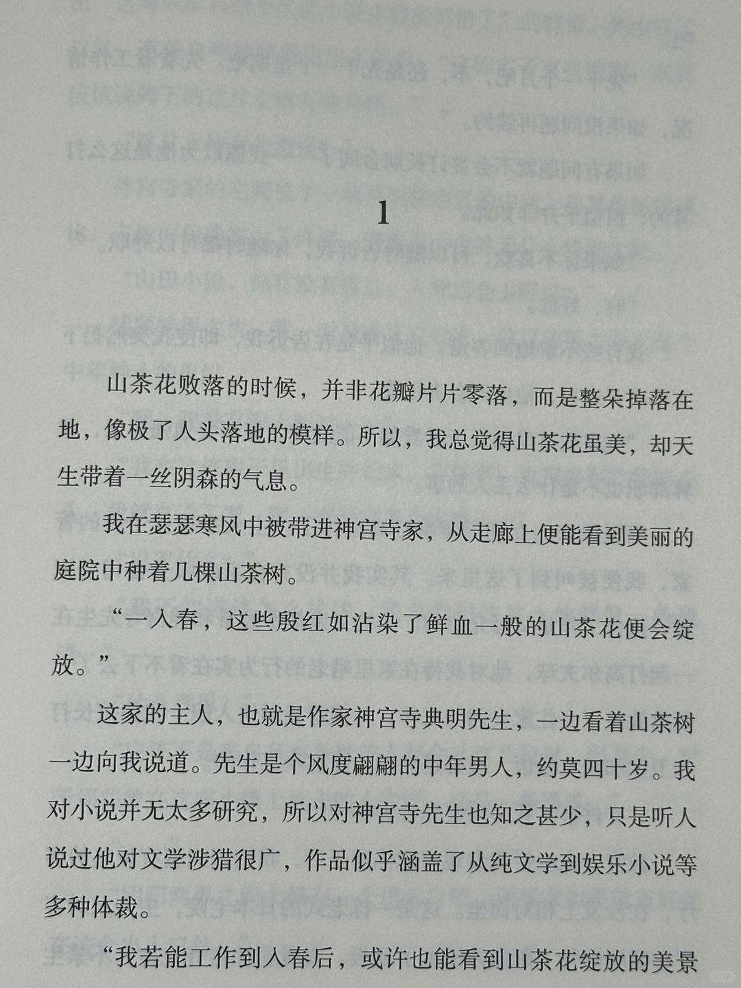 山茶花败落的季节里,伴着空气中阴森的气息,“我”被带进了神宫寺家应聘女佣。主人神宫寺典明先生是一位作家,他告诉“我”这座房子位于阴阳两界之间的出入口上。“我”本来有些不知所措,奈何主人开出的薪水太过诱人,“我”应承下了这份工作。