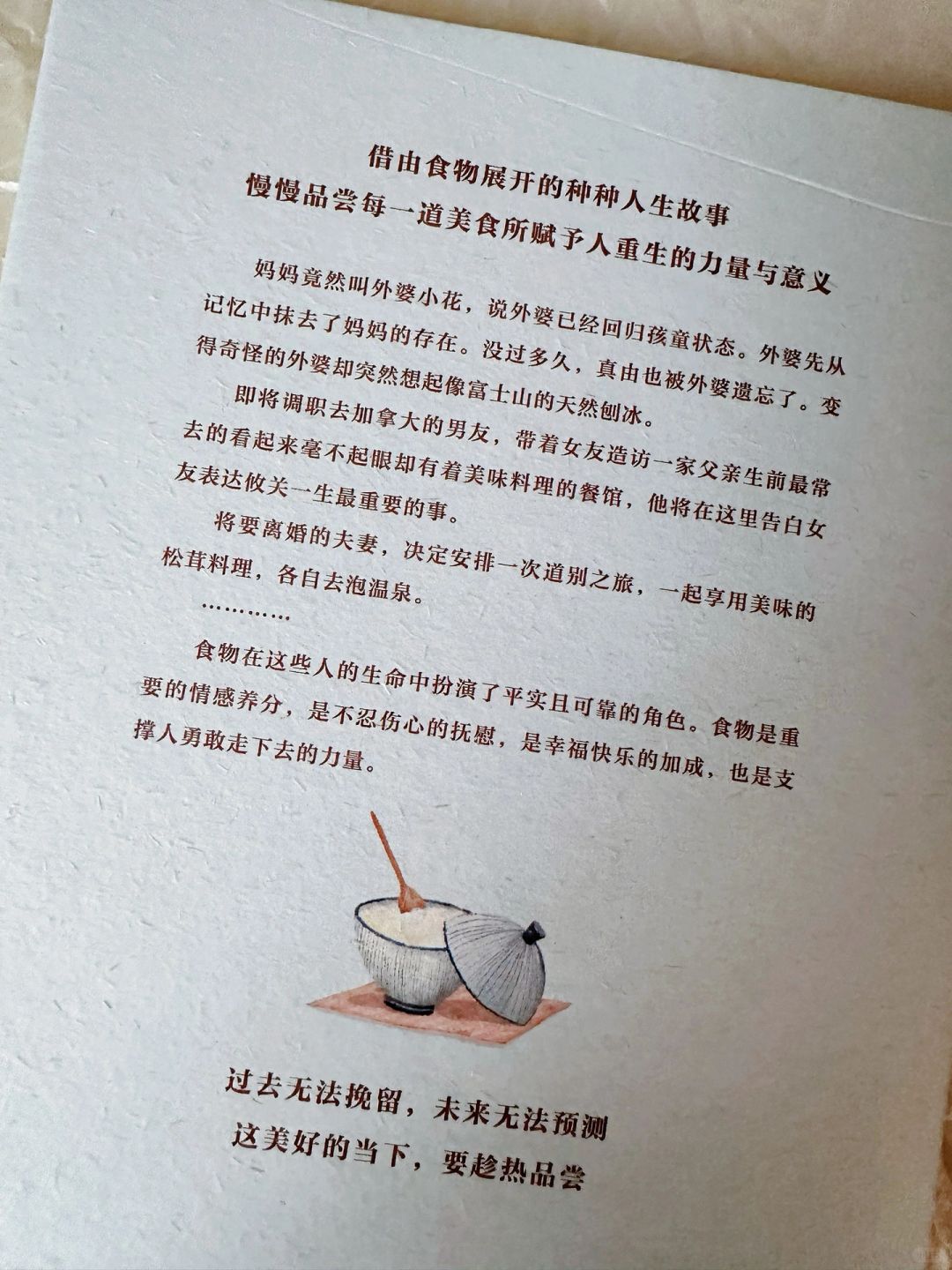 这本书是小川糸散文的随笔新作,一如既往地,她把带有浓厚疗愈色彩的的文字带给我们,她在书中为我们讲述的5个借由食物展开的人生故事,仿佛一道道精心烹制的菜肴,让我们品尝到能让心灵为之一颤的生活滋味。
