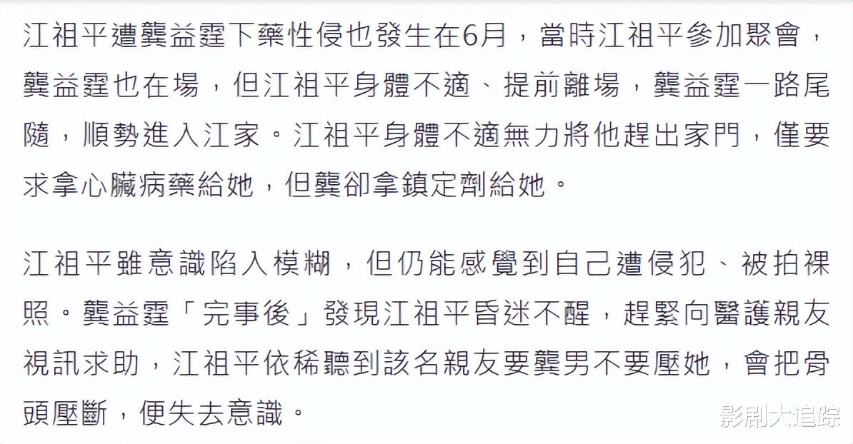 龚益霆却不同意,还在江祖平6月参加聚会后,尾随其回家,最后迷晕了她,拍下不少不雅视频,期间还因喂药过度,差点害死江祖平。