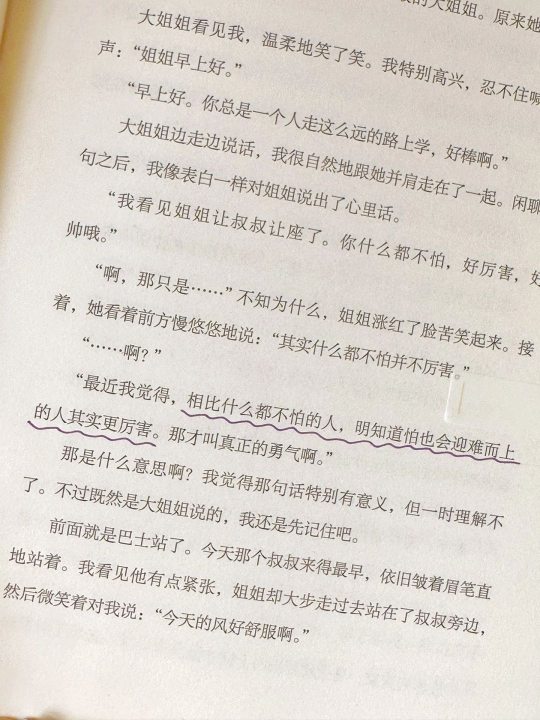 “其实什么都不怕并不厉害。相比什么都不怕的人,明知道怕也会迎难而上的人其实更厉害。那才叫真正的勇气啊!”