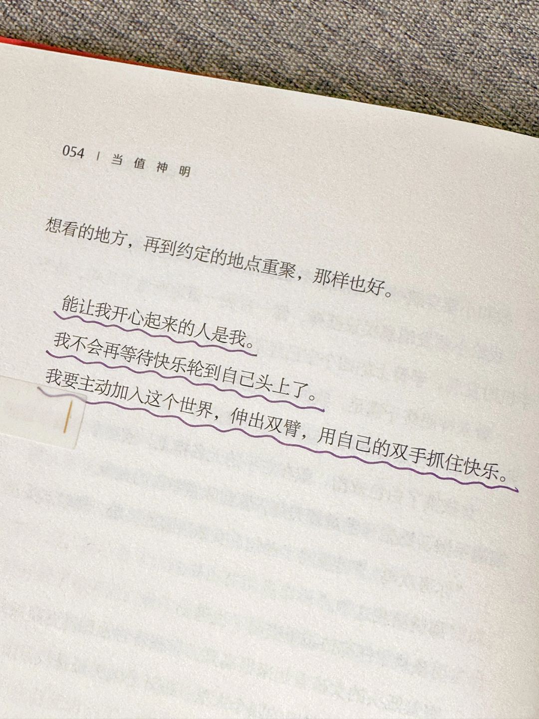 “能让我开心起来的人是我。我不会再等待快乐轮到自己头上了。我要主动加入这个世界,伸出双臂,用自己的双手抓住快乐。”