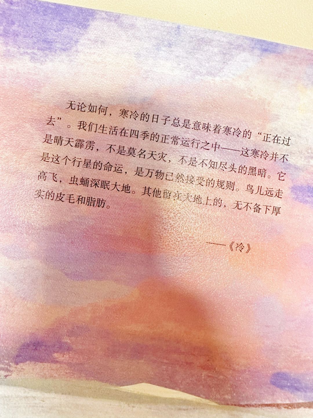 无论如何,寒冷的日子总是意味着寒冷的“正在过去”。我们生活在四季的正常运行之中一一这寒冷并不是晴天霹雳,不是莫名天灾,不是不知尽头的黑暗。它是这个行星的命运,是万物已然接受的规则。鸟儿远走高飞,虫蛹深眠大地。其他留在大地上的,无不备下厚实的皮毛和脂肪。