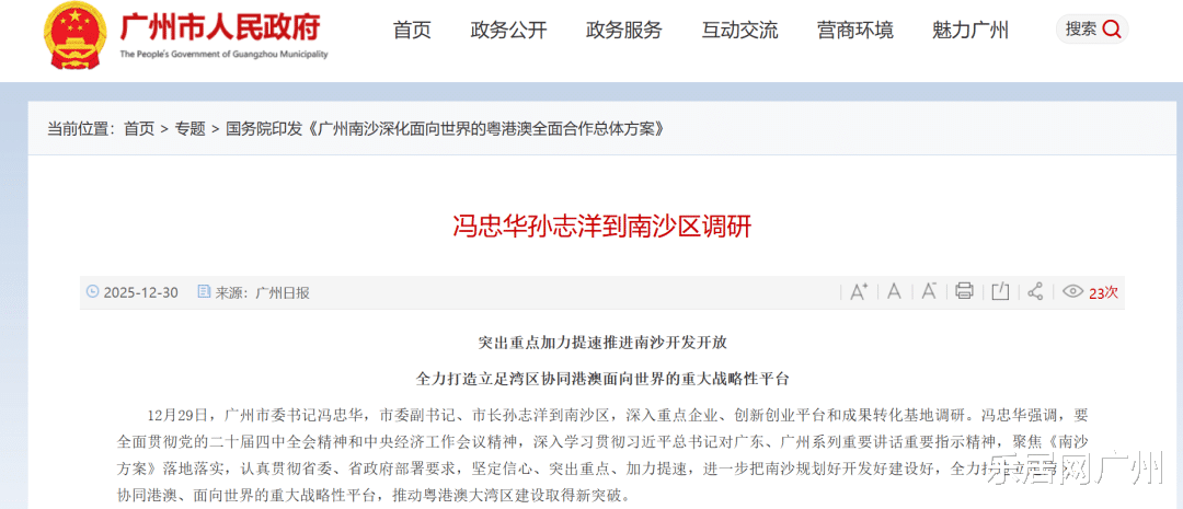 近日,刚刚履新的广州市委书记冯忠华,把调研首站选在了南沙。