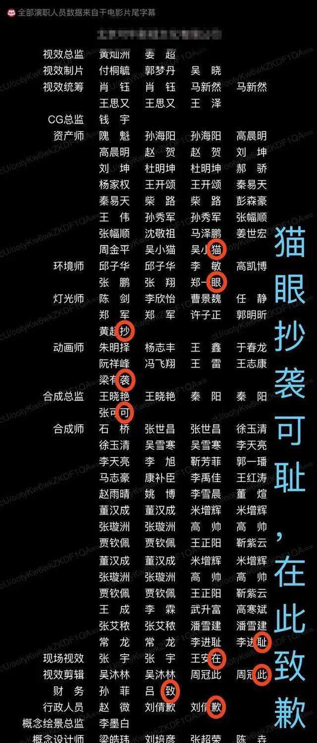 CMDB团队那可是相当有策略,为了给“猫眼专业版”的抄袭行为来个“当场抓获”,在新发布的春节档大片《封神第二部:战火西岐》的数据里,他们故意设了个“小陷阱”。他们在数据里偷偷加了一个片尾字幕里压根就没出现过的人名“吴小猫”,同时还虚构了好多其他名字。嘿,你猜怎么着?这“猫眼专业版”就像个没长眼睛的小迷糊,照单全收,把这些虚构的内容都一股脑儿地抄过去了。而且啊,CMDB在文章里还透露了个超有趣的细节,他们故意把每个职位最后一个名字的最后一个字串起来,连读就是:“猫眼抄袭可耻,在此致歉。”这简直就是在给“猫眼专业版”来了个公开点名批评,太有戏剧性了。