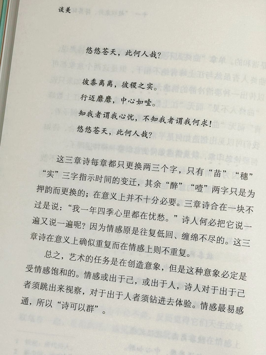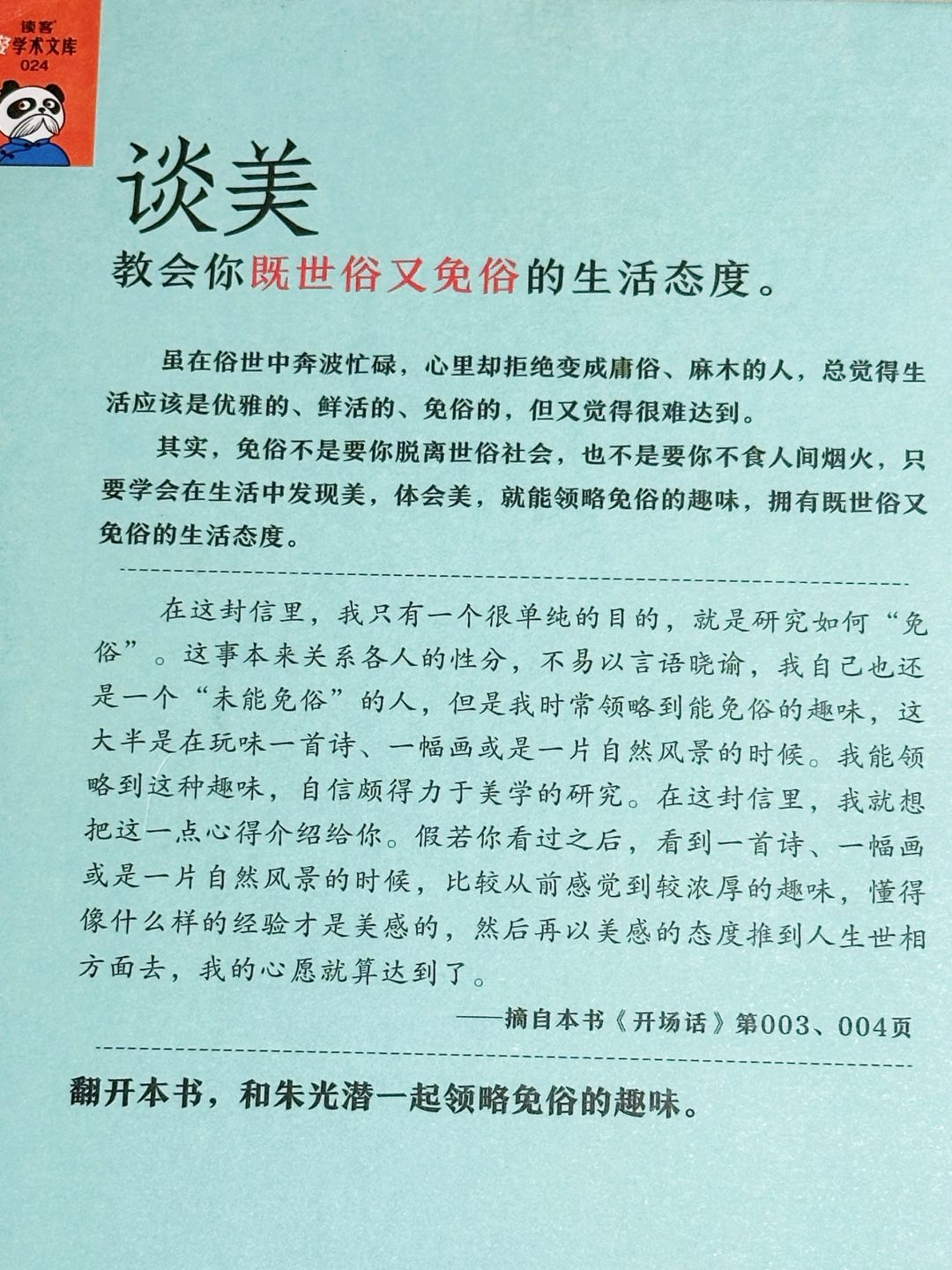 🔖这本书采用了书信体的形式,从“要求人生净化,先要求人生美化”的理念出发,顺着美感态度的特性、艺术与人生的距离、美感经验与移情的关系、美感与快感、自然美与艺术美等问题次第展开,文字明白晓畅,充满了真知灼见。随手翻到一页,都能收获对美的新知。