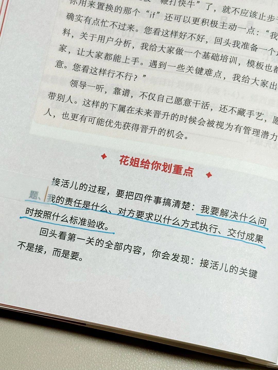 🔖这本《干得漂亮》是继《沟通的方法》之后我拜读的花姐第二部大作。特别喜欢她的行文方式,仿佛一位内力深厚却又亲切随和的大姐姐,毫无保留地用接地气的语言将她的独家心法倾囊相授,恨不得手把手再带出一批武林高手!