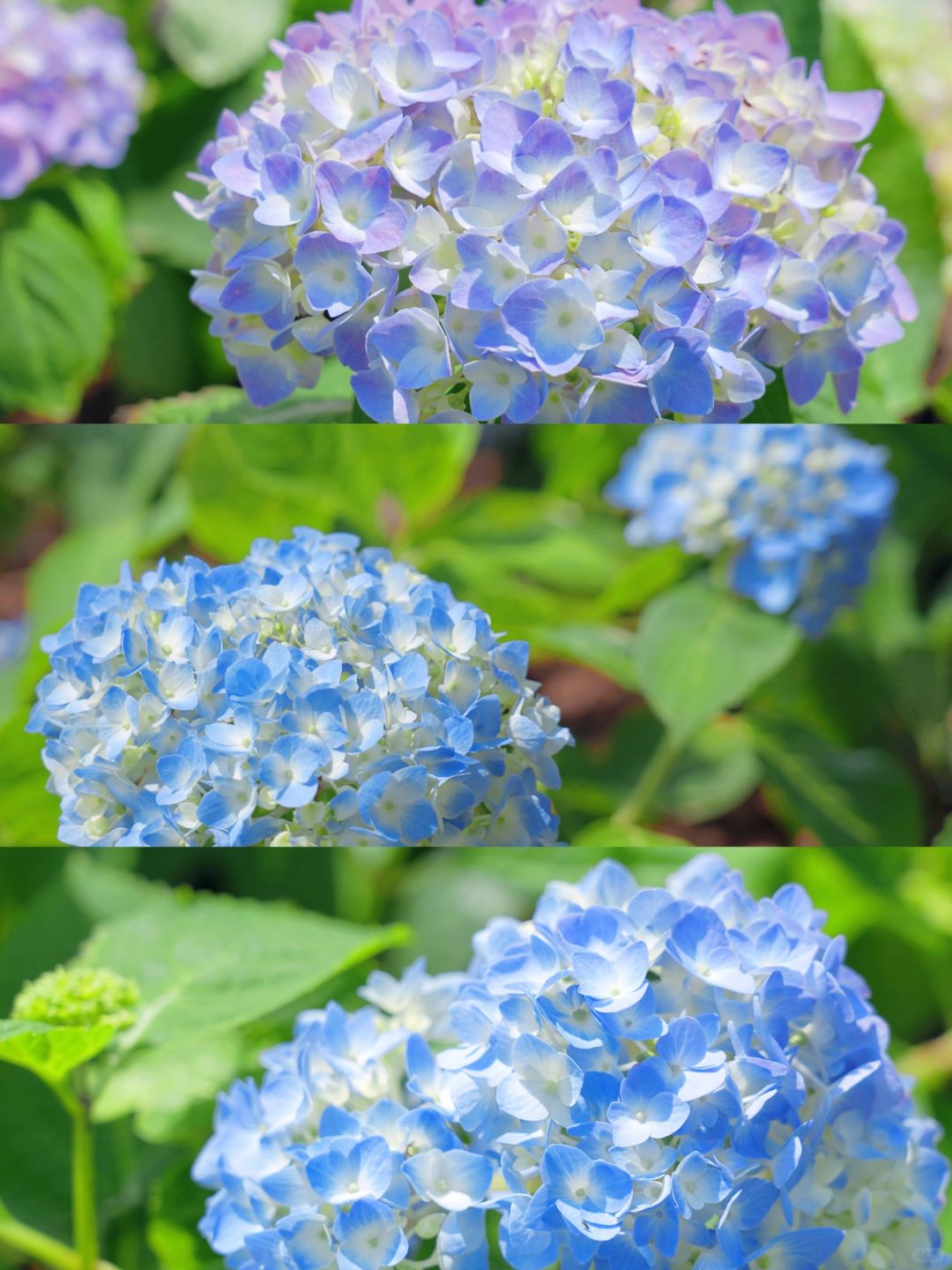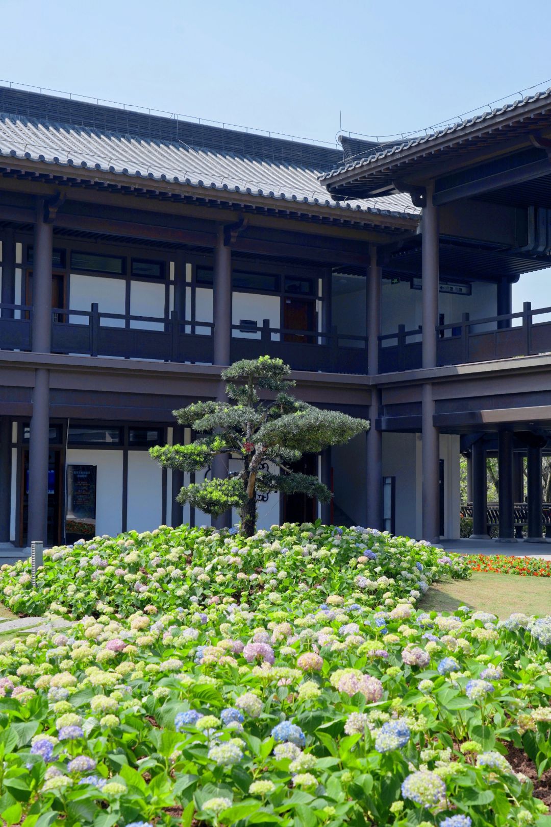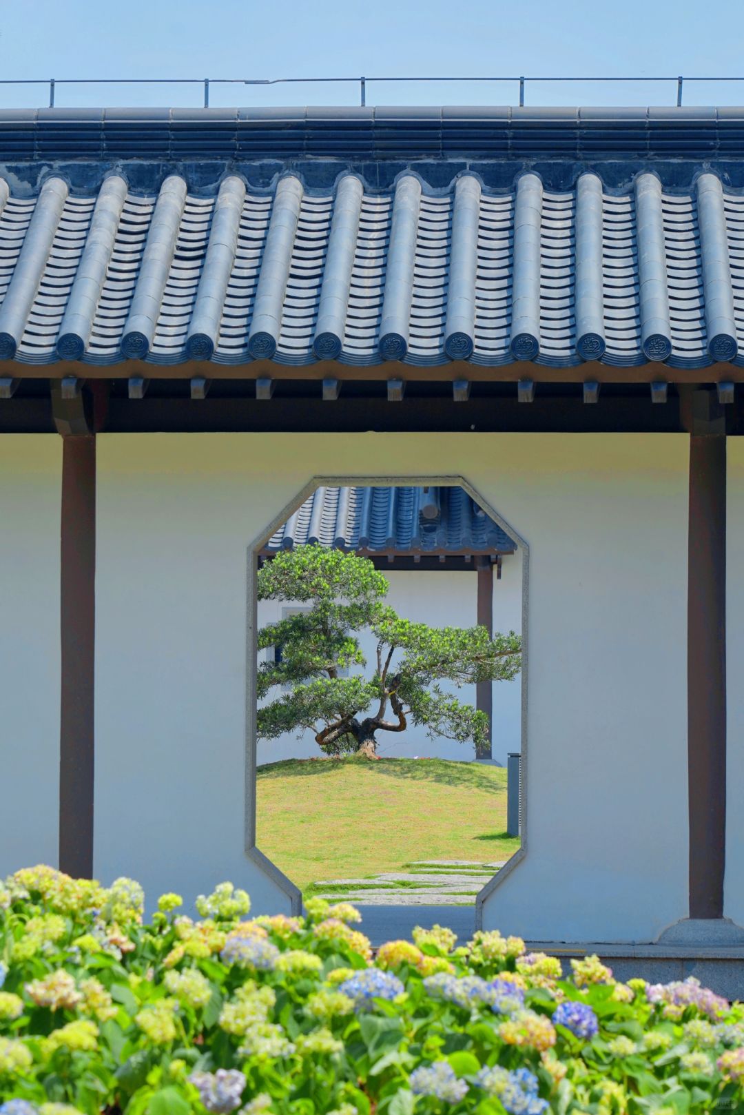 🔸新种上的绣球花主要集中在公共文化中心的庭院里,可以登高俯拍整体风景,也能利用庭院连廊窗台形成框景构图
