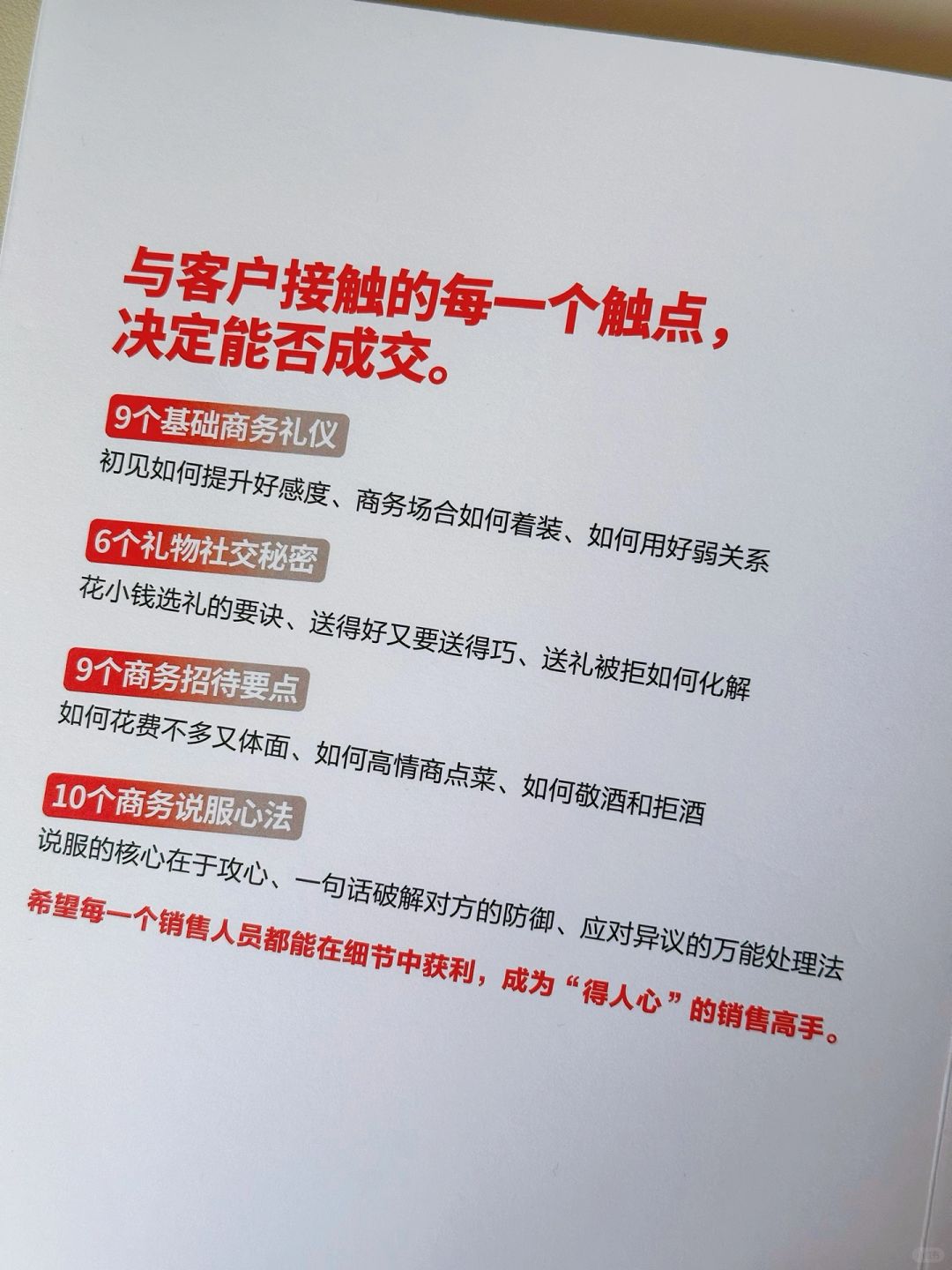 🔖这本书是经管畅销书作者倪建伟的新作。他认为真正卓越的销售都是通过商务细节“得人心”的销售,细节决定成交。通过有22年从业经验的销售总经理教授的34堂销售实战商务礼仪课,从基础商务礼仪、礼物社交、商务招待和说服心法4️⃣个方面帮我们和客户有效互动,让每一次和客户打交道都助力成交。