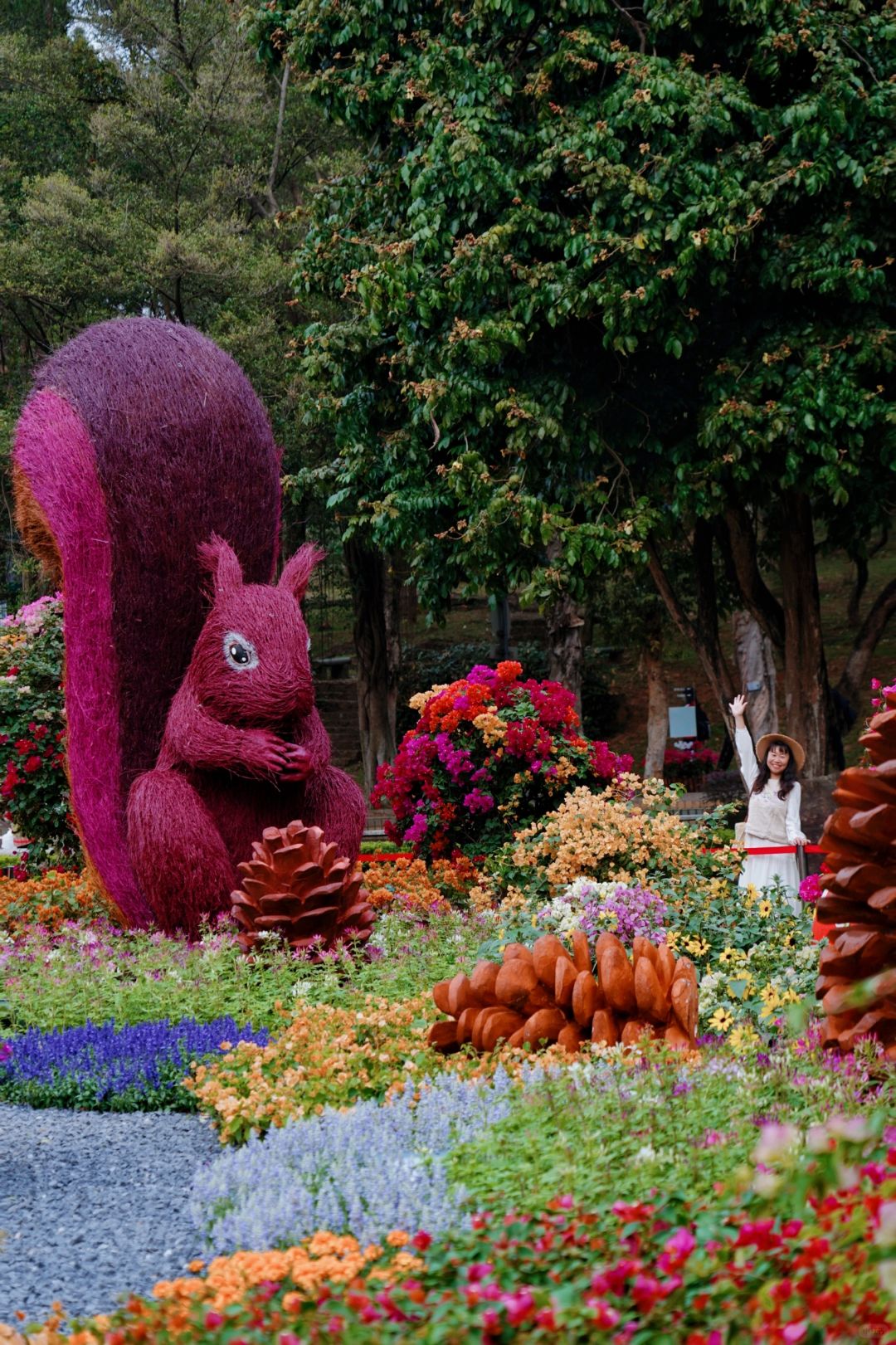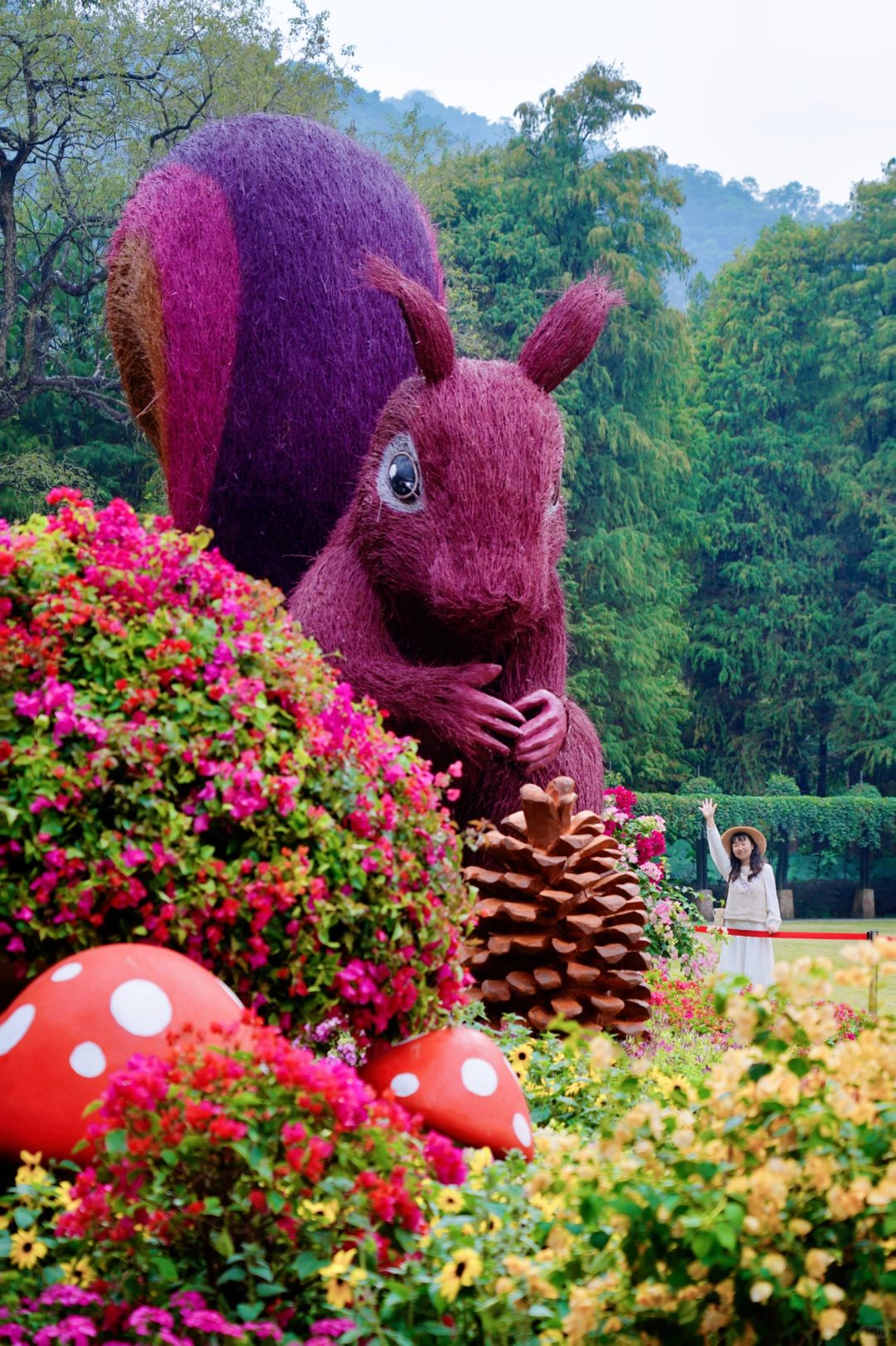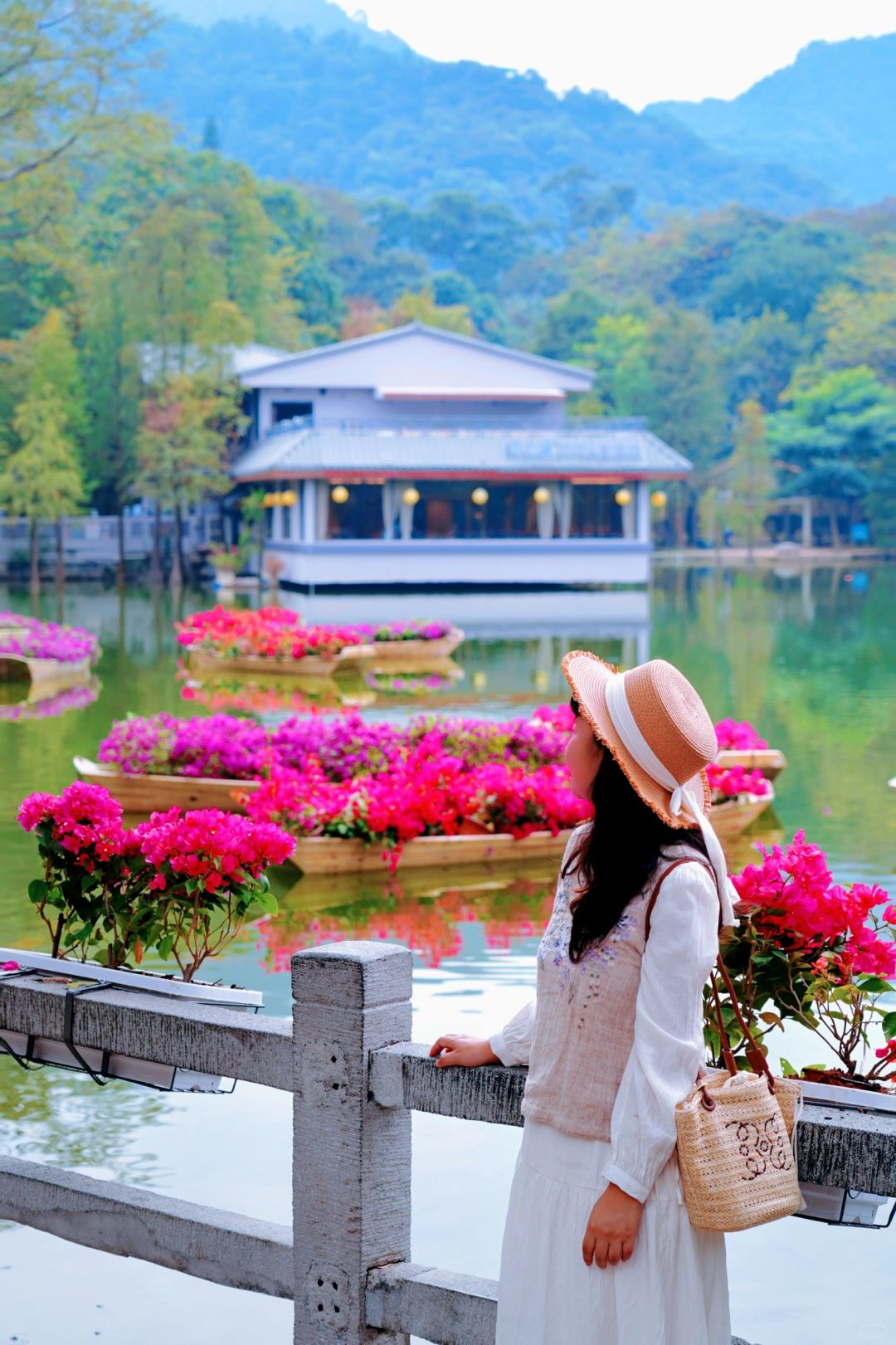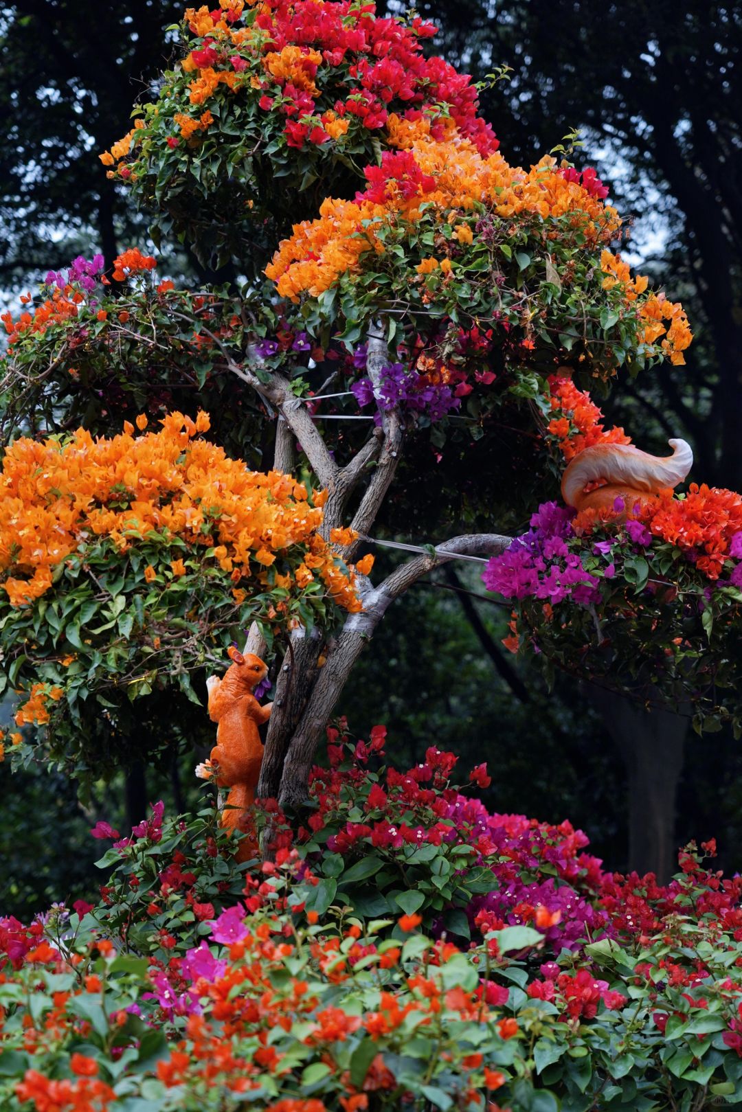 🔸明珠湖:湖中小船里是盛开的簕杜鹃,几只小船又组成了花瓣。湖边大草坪上是小松鼠簕杜鹃,如果遇到拍照的人多,不妨围着大圈找角度