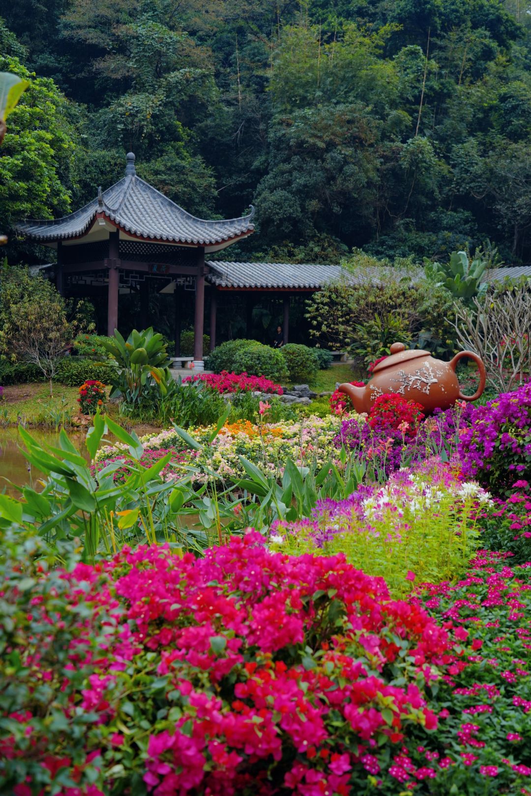 🔸云山茶苑:亭台轩榭,园中有片小池塘,池塘中的茶壶簕杜鹃颇有点儿古风禅意